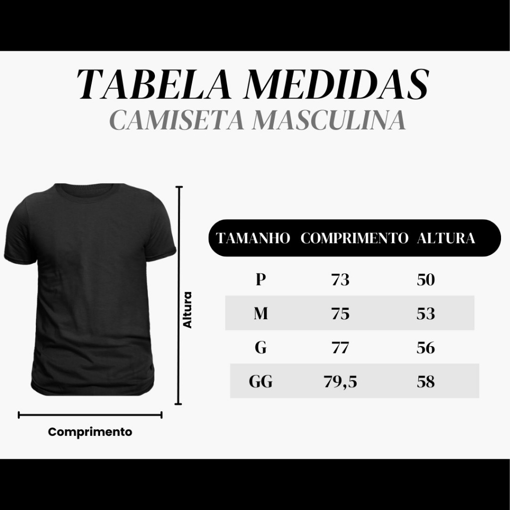Seja bem-vindo(a) Sobre sua nova camiseta: -Fabricada em malha 100% Algodão com toque macio de ótima qualidade, tecido leve e encorpado. -Estampa pelo método de DTF mantendo cores vivas, que não desbotam mesmo com as lavagens. -Modelagem casual que veste super bem, com ótimo caimento. -Costuras duplas nas barras e reforço com viés que vai de ombro a ombro, proporcionando maior resistência a sua camiseta. Trabalhamos com amplo estoque, garantindo todos os tamanhos a pronta entrega.