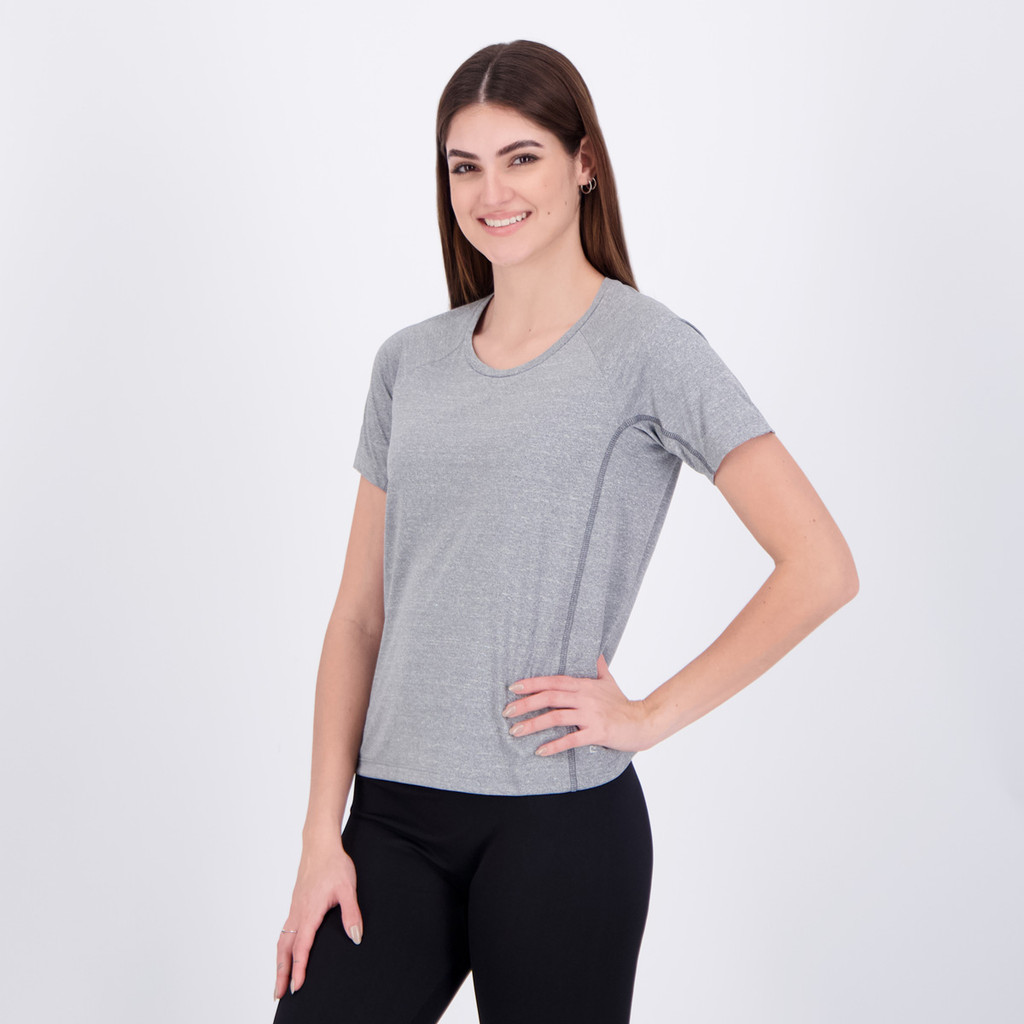 Composição: 100% Poliamida Cor predominante: Cinza Indicado para: Treino Bolsos: Sim, dois laterais Gênero: Feminino Origem: Nacional Logo: Estampada Manga: Curta Gola: Careca Dimensões aproximadas (A x L): P: 57 x 44 cm M: 59 x 46 cm G: 61 x 48 cm GG: 63 x 50 cm