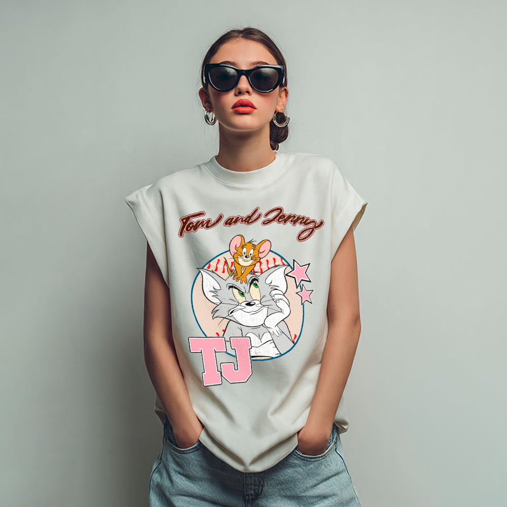 Camiseta Regata Feminina Muscle Tee Ampla Sem Manga Tom E Jerry Cartoon Desenho Amigos Estilo Americano