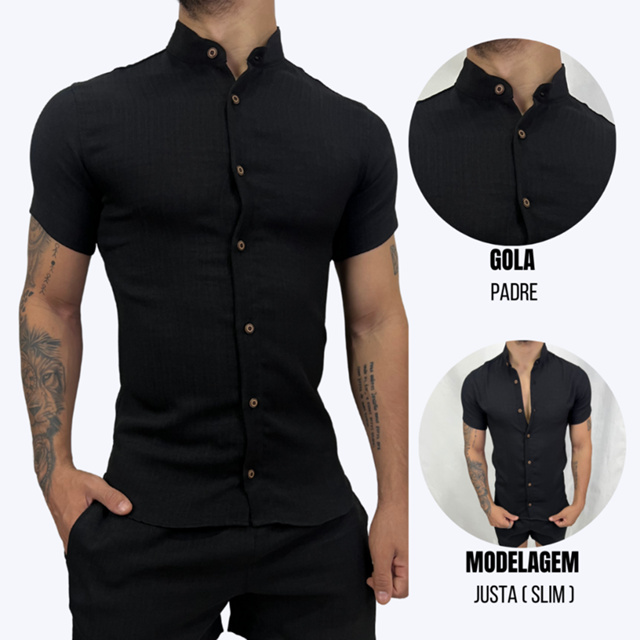 Camiseta Social Manga Curta Gola Padre Com Algodão Masculina Slim Fit Gola Padre Blusa Linho