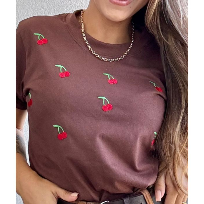 Camiseta T-shirt feminina premium 100% algodão cereja estampa borbado com gola em ribana
