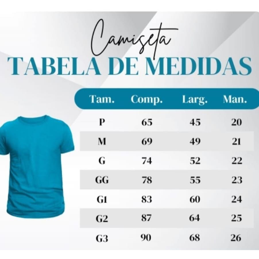 Esta camiseta é confeccionada em tecido 100% algodão, perfeita para o estilo casual do dia a dia. Com um design unissex e moderno, ela está disponível em tamanhos para adultos (P a GG) e também em tamanhos plus size (G1 a G3). Tamanhos Adulto: P: Comprimento: 61 cm | Cintura: 44 cm M: Comprimento: 66 cm | Cintura: 50 cm G: Comprimento: 69 cm | Cintura: 51 cm GG: Comprimento: 78 cm | Cintura: 53 cm Tamanhos Plus Size: G1: Largura: 60 cm | Altura: 84 cm G2: Largura: 62 cm | Altura: 87 cm G3: Largura: 65 cm | Altura: 91 cm G4: Largura: 67 cm | Altura: 95 cm G5: Largura: 70 cm | Altura: 98 cm Observações: Imagem meramente ilustrativa. Algumas tonalidades de cores podem sofrer alterações de acordo com seu monitor ou celular. As medidas das camisetas podem variar em 2 cm para mais ou para menos e a malha poderá encolher até 5% após a primeira lavagem. Especificações do Produt Modo de Lavar: Lavar normalmente, mas evite o uso de buchas diretamente na estampa. Agradecemos pela sua compra e esperamos vê-lo novamente em breve!