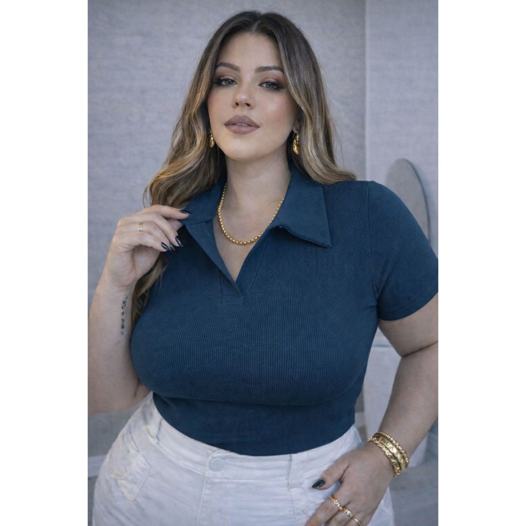 camiseta t shirt polo listrada canelada confortavel manga curta feminina dia a dia casual PLUS SIZE