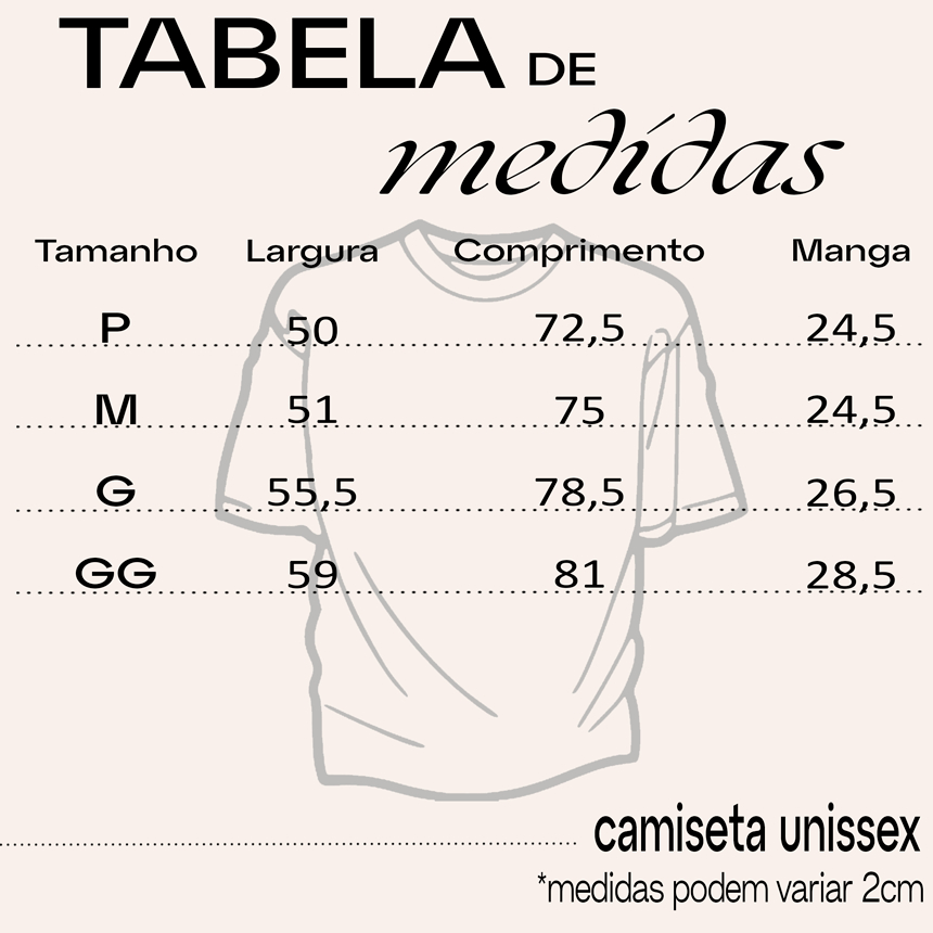 Nossas camisetas são 100% algodão . As estampas são feitas por DTF este processo por transferência garante que a qualidade da impressão é mantida, ou seja, a solidez da cor é assegurada, entre todas as técnicas de estamparia a DTF é uma das melhores do mercado atualmente. SE ATENTE AO ESCOLHER CORES E TAMANHOS, NÃO CONSEGUIMOS FAZER ALTERAÇÕES APÓS A COMPRA! ATENÇÃO** AS MEDIDAS PODEM VARIAR 2cm PARA MAIS OU PARA MENOS Camiseta: CUIDADOS COM O PRODUTO: - Lave a camiseta com o lado da estampa pelo avesso, evite amassá-los - Não utilize alvejante, água: quente, ou lavagem no Modo Pesado da sua máquina - Lave de preferência em água fria, NÃO deixando o seu moletom de molho - Estenda após a lavagem, com secagem de preferência na sombra - Não passe o ferro por cima da estampa - Passe sempre pelo avesso e utilize preferencialmente uma tábua de passar forrada. Se você ainda tiver qualquer dúvida, envie sua pergunta pelo chat , iremos responder o mais rápido possível. Pergunte quantas vezes precisar ❤️❤️
