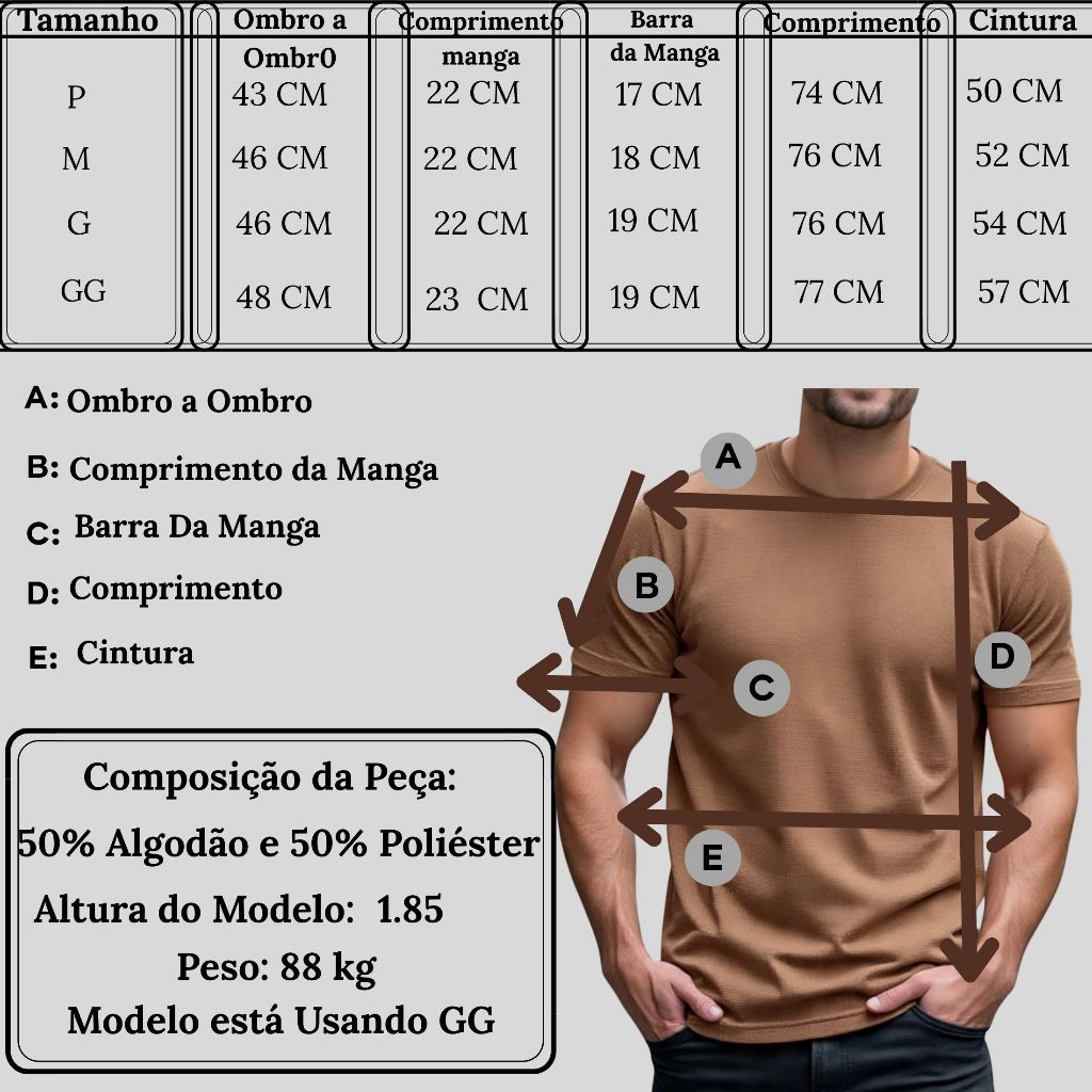 Pensando no público mais casual e neutro, a camiseta confort trás um tecido mais leve com um caimento delicado, na qual cai bem em qualquer estação. Peça conta com um textura equilibrada para dias quentes ou dias de frio. Para te ajudar a fazer a melhor escolha, aqui está as medidas: P Comprimento Total Costa: 74 cm Largura Cintura: 50cm Largura Barra Manga: 17 cm Comprimento Manga: 22 cm Largura Ombro a Ombro: 43 cm M Comprimento Total Costa: 76 cm Largura Cintura: 52 cm Largura Barra Manga: 18cm Comprimento Manga: 22 cm Largura Ombro a Ombro: 46 cm G Comprimento Total Costa: 76cm Largura Cintura: 54 cm Largura Barra Manga:19 cm Comprimento Manga: 22 cm Largura Ombro a Ombro: 46cm GG Comprimento Total Costa: 77cm Largura Cintura: 57 cm Largura Barra Manga: 19 cm Comprimento Manga: 23cm Largura Ombro a Ombro: 48cm * As medidas podem ter até 1cm de diferença em relação a tabela