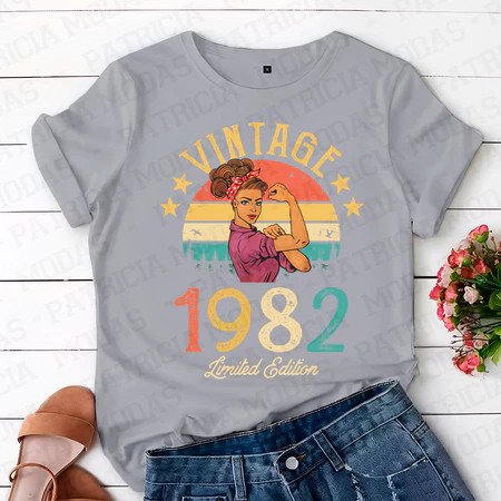 | Camiseta Unissex 100% Algodão, Mulher-Vintage 1982, Estampa Vintage... este produto | R$ 25,75 | 57% | 5.0/5 | — |