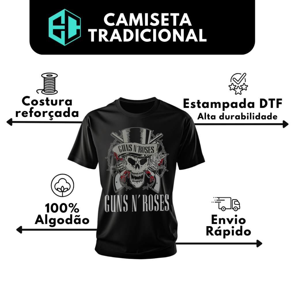 | Camiseta Unissex Guns N' Roses Banda de Rock 100% algodão este produto | R$ 31,90 | 20% | 5.0/5 | — |