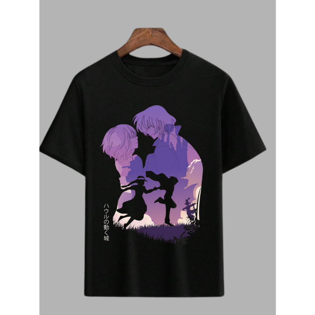 Camisetas Romance Desenho Anime Japonês T-short Oversezed Preto e Branco Castelo Animado Frente Blusa Manga Curta Estampada Geek Casal Filme Camiseta 100% Algodão