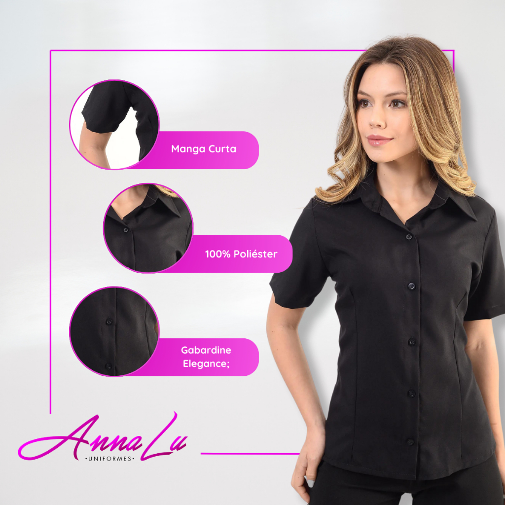Você é capaz de vencer qualquer desafio. Annalu Uniformes, a marca que empodera você! • Há mais de 08 anos uniformizando equipes; • Somos loja de fábrica; • Com envio imediato para todo o país; • Com compra garantida, com características essenciais para você que busca o distribuidor certo para os uniformes de sua empresa. TABELA DE MEDIDAS (cm): • PP » Ombro: 11cm / Busto: 93cm / Costas: 38cm / Cintura: 86cm / Quadril: 96cm / Comprimento: 59cm; • P » Ombro: 11cm / Busto: 94cm / Costas: 39cm / Cintura: 90cm / Quadril: 96cm / Comprimento: 59cm; • M » Ombro: 13cm / Busto: 102cm / Costas: 40cm / Cintura: 97cm / Quadril: 108cm / Comprimento: 63cm; • G » Ombro: 13cm / Busto: 108cm / Costas: 42cm / Cintura: 104cm / Quadril: 116cm / Comprimento: 65cm; • GG » Ombro: 14cm / Busto: 115cm / Costas: 45cm / Cintura: 110cm / Quadril: 126cm / Comprimento: 67cm; • XGG » Ombro: 16cm / Busto: 118cm / Costas: 47cm / Cintura: 116cm / Quadril: 132cm / Comprimento: 72cm; • G2 » Ombro: 16cm / Busto: 128cm / Costas: 49cm / Cintura: 122cm / Quadril: 142cm / Comprimento: 75cm; • G3 » Ombro: 17cm / Busto: 132cm / Costas: 51cm / Cintura: 128cm / Quadril: 150cm / Comprimento: 77cm. FICHA TÉCNICA: • Camisete Social Feminina Manga Curta; • Confeccionado em Gabardine Elegance; • Composição: 100% Poliéster; • Modelo: Social, com Manga Curta; • Cores: Branco, Preto e Azul Marinho; • Marca: ANNALU Uniformes; • Numerações: PP ao GG (Trabalhamos com tamanhos Plus Size). PERGUNTAS FREQUENTES: • POSSO COMPRAR EM QUANTIDADE COM TAMANHOS DIFERENCIADOS? Sim, sem problemas. Pedimos que entre em contato conosco, após a compra, para confirmar as numerações desejadas. Caso as numerações não sejam especificadas, entendemos que todas as unidades compradas são do mesmo tamanho. • QUAL NOSSO PÚBLICO PRINCIPAL? Somos uma empresa de uniformes profissionais, focada em uniformes administrativos e cozinha. • QUERO TROCAR MEU PRODUTO. COMO FUNCIONA? Em caso de trocas é preciso entrar em contato com o vendedor pelo campo do pós-venda.