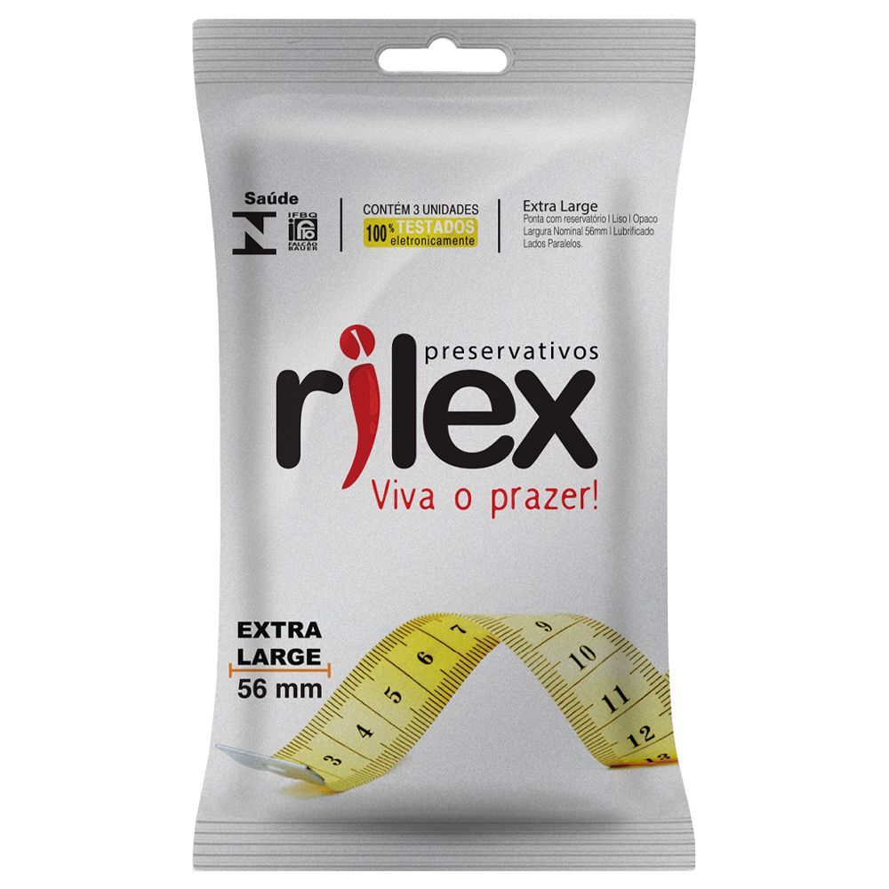Estamos muito felizes de receber você em nossa loja! Fique à vontade para tirar suas dúvidas pelo Chat! ===== Privacidade garantida para você! 🔒 Tudo foi pensado para sua tranquilidade: ✅Embalagem discreta: usamos caixas de papelão simples, sem nenhuma informação sobre o conteúdo. ✅Sem nome da marca: a embalagem não traz menção ao nome ou logo do fabricante do produto. ✅Etiqueta neutra: usamos apenas a razão social, que é bem discreta. ✅Nota fiscal sigilosa: a descrição dos produtos não aparece na nota fiscal. ✅Envio seguro: todos os pedidos são embalados com cuidado e proteção. ✅Confiança total: você compra sem preocupações e recebe tudo com discrição! ===== Qualidade que você pode confiar! ⭐ Distribuidora oficial: trabalhamos apenas com marcas reconhecidas e de confiança. 📦 Estoque renovado: nossos produtos são sempre fresquinhos, com reposição constante. 🕑 Validade garantida: nunca enviamos produtos com validade curta. ❌ Nada de ponta de estoque: só oferecemos produtos em perfeitas condições. ✅ O que você vê é o que recebe: tudo está detalhado na descrição, sem surpresas. 💎 Invista na qualidade: escolha o melhor, porque você merece! =====Preservativo Rilex Extra Grande com 30 unidades 10x3 *****ATENÇÃO***** Você irá receber 10 pacotes. Cada pacote contém 3 unidades São 10 pacotes com 3 unidades (10x3 = 30) Totalizando 30 preservativos e NÃO pacotes. Agora não tem mais desculpas para falar que não gosta de preservativo porque aperta! Os 56mm de largura te deixa super confortável, mas com muita segurança. Composição: Látex de borracha natural e óleo de silicone (lubrificante). ========
