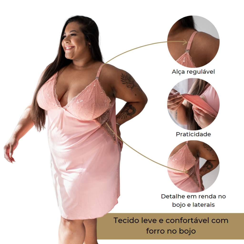 Amamentar é alimentar de amor, carinho e dedicação. É o amor que engrandece. 🤰🥰 Pensamos nesse momento tão especial e assim desenvolvemos a camisola amamentação que além de linda é super confortável e prática. Essa camisola amamentação plus size é produzida com tecido de alta qualidade e possui detalhes em renda. Alças possuem regulagem e o bojo é forrado e possui um fecho com click para facilitar a amamentação. TABELA DE MEDIDAS P veste 50 M veste 52 G veste 54 GG veste 56 Características: - Confeccionado em romantic e renda - Detalhe de renda no bojo e laterais - Alças com regulagem - Laço de cetim Composição: Romantic - 92% Poliéster e 8% Elastano Renda - 90% Poliamida e 10% Elastano Após a confirmação do pagamento, o pedido está sendo enviado. Esteja à vontade para tirar dúvidas conosco utilizando o espaço de perguntas. #sejalit #belit