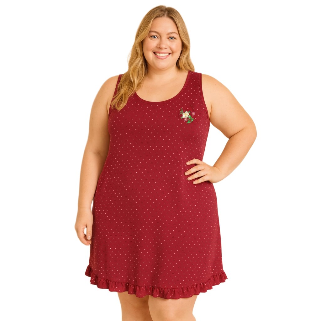 Camisola plus size curta e sem mangas, modelagem reta e soltinha ideal para o verão. Decote arredondado, aplicação bordada na altura do busto, na barra, apresenta acabamento com babado delicado, que dá um toque mais feminino e leve ao visual. Guia de tamanhos: G1 veste manequim 46 - 48 / busto 128 - 142 cm / cintura 134 - 149 cm / comprimento 100 cm G2 veste manequim 50 / busto 143 - 157 cm / cintura 150 - 165 cm / comprimento 103 cm G3 veste manequim 52 - 54 / busto 158 - 172 cm / cintura 166 - 181 cm / comprimento 106 cm