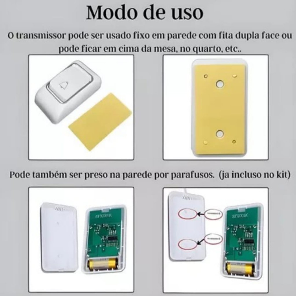 Campainha Externa Sem Fio Com Alcance De Ate 100 M. Pronta a Entrega e Envio IMEDIATO ! Faça sua Compra ;) A Campainha Residencial Sem Fio Wireless é perfeita para quem procura segurança e praticidade em sua casa. Com design resistente a água, você pode instalá-la em qualquer lugar, sem se preocupar com a umidade. Além disso, ela não precisa de fios, tornando a instalação muito mais fácil e rápida. Com toques elegantes e tecnologia avançada, esta campainha é uma escolha inteligente para qualquer lar moderno. BENEFÍCIOS: - Ótimo Custo Beneficio. - Fácil instalação sem fios. - Conveniente para uso em várias áreas da casa. - Sem necessidade de fios ou cabos, o que permite um design limpo e organizado. - Tecnologia avançada para garantir qualidade de som clara. - 32 Opções de personalização com vários toques disponíveis. CARACTERÍTICAS: - Material da carcaça ABS. - Transmissor: <10mW. - Frequência de trabalho: 315 +/- 2MHz. - Volume aproximado: 75dB. - Transmissor alimentado por bateria 12V 1x23A. - Alcance do Sinal: até *100 metros de distancia. - Opções de Toque: 36 opções de toques diferentes. ITENS INCLUSOS: - 01 Campainha Externa Sem Fio. Qualquer dúvida, estou a disposição. Aguardo sua Compra.