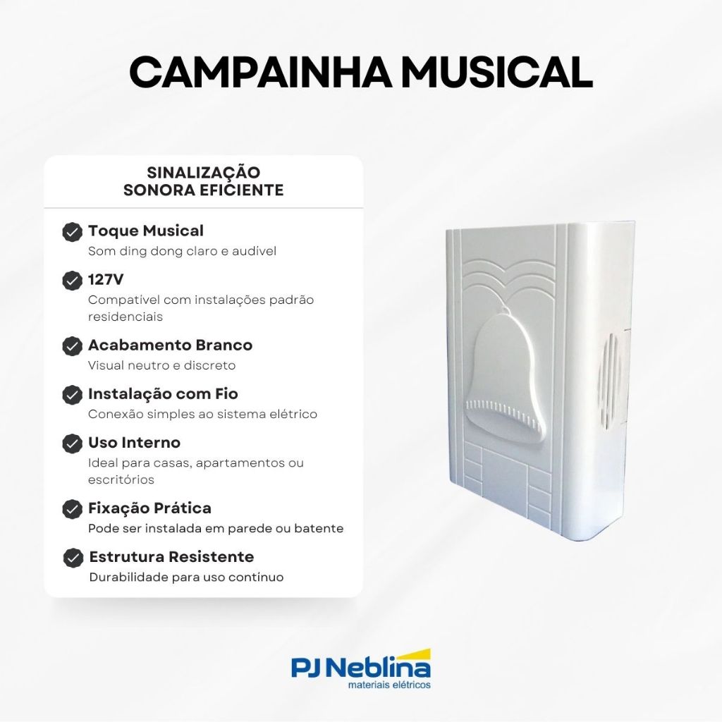 Campainha Musical com Fio 127V Branca Ding Dong - DNI CARACTERISTICAS: • Campainha com fio no clássico estilo “ding dong”, de fácil identificação sonora. • Design compacto e discreto na cor branca, ideal para todos os tipos de ambiente. • Instalação simples em sistema com fio, com funcionamento estável e confiável. • Emite som agradável e com bom alcance, garantindo que seja ouvida em toda a residência. • Corpo leve e resistente, com acabamento de qualidade. • Solução econômica e eficiente para sinalização de chamadas. • Produto DNI, reconhecido por sua durabilidade e bom desempenho. APLICAÇÃO: • Ideal para sinalização de entrada em casas, apartamentos e estabelecimentos comerciais. • Indicada para uso interno em locais onde se deseja um aviso sonoro claro e eficiente. • Compatível com sistemas elétricos residenciais de 127V com fiação convencional. ESPECIFICACOES TECNICAS: Marca: Dni Produto: Campainha Musical Tipo: Com Fio Cor: Branco Som: Ding Dong Tensão de Funcionamento: 127Vac Potencia Máxima: 1,5W Dimensões Aproximadas (LxAxP): 10,5 x 15,2 x 3,6cm. Garantia do Fabricante: 6 Meses.