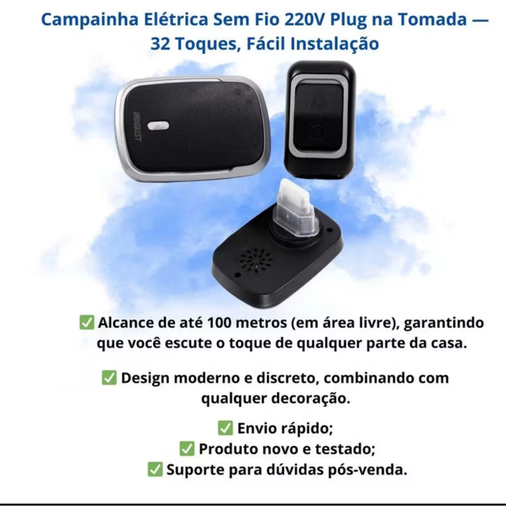 🔔 Heyli apresenta: Campainha Sem Fio – Praticidade e Conforto na Sua Casa! Transforme sua rotina com a campainha sem fio da Heyli, pensada para oferecer mais comodidade, modernidade e eficiência no seu dia a dia. Com instalação simples e design elegante, é a escolha ideal para quem busca funcionalidade sem abrir mão da estética. ✅ Principais Benefícios: 🔧 Instalação fácil e sem fio: Dispensa o uso de ferramentas ou eletricistas — é só fixar e usar! 📶 Alcance de até 30 metros: Excelente performance mesmo em ambientes amplos.(O alcance de até 30 metros é a distância máxima em campo aberto, sem paredes ou interferências.Em ambientes internos, com paredes, portões ou obstáculos, o alcance pode ser reduzido significativamente, variando conforme o local.Isso é normal para todos os modelos de campainha sem fio.) 🎵 Vários toques + volume ajustável: Personalize com melodias diferentes e escolha o volume ideal para você. 🔋 Alta durabilidade: Bateria de longa vida útil e funcionamento confiável. 🏡 Design moderno e discreto: Combina com qualquer estilo de ambiente, do clássico ao contemporâneo. Ideal para casas, apartamentos, consultórios, comércios e muito mais. A campainha da Heyli une tecnologia, qualidade e facilidade de uso — tudo o que você precisa em um só produto! 📦 Itens Inclusos ✔️ 1 Acionador (transmissor) da campainha ✔️ 1 Receptor musical interno bivolt ✔️ Fita dupla face já fixada no transmissor ✔️ 1 Bateria alcalina 12V modelo 23A ⚡ Estoque Limitado! 👉 Clica em “Comprar Agora” e garante o seu antes que acabe! ✨Entrega em 24 horas, período de garantia de 30 dias✨ 💬 Dúvidas? Manda um “Oi” no chat — te respondo mais rápido que sambinha de raiz! 🎸