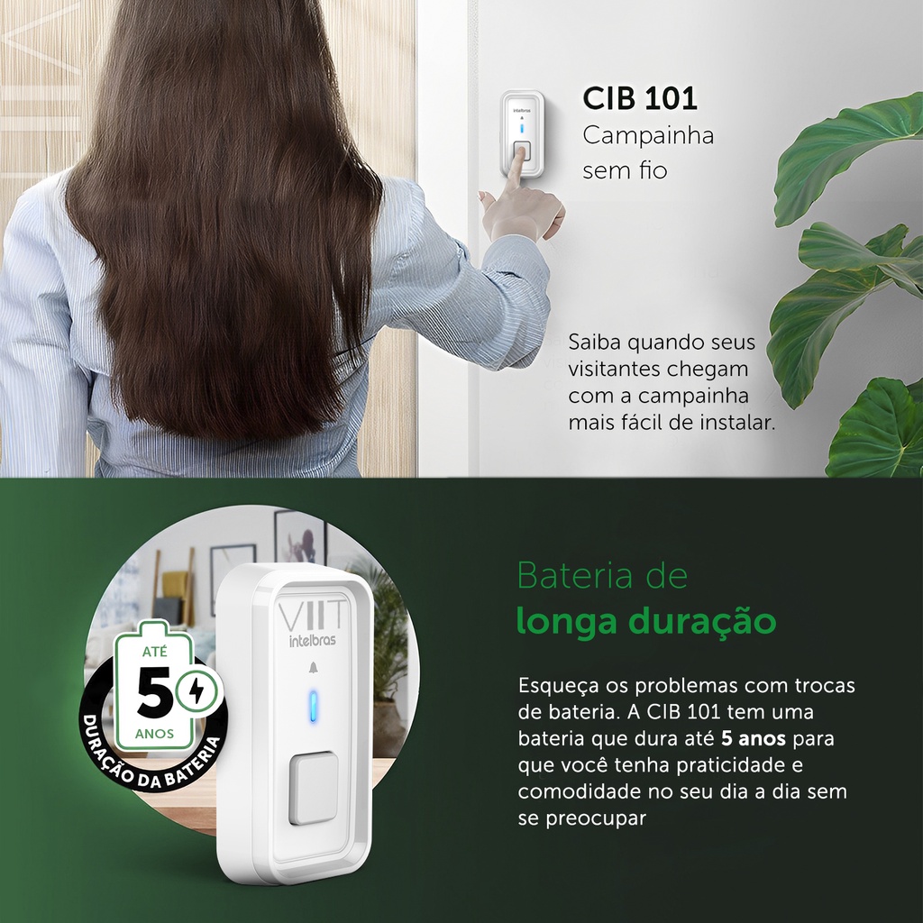 Saiba quando seus visitantes chegam com a campainha mais fácil de instalar! A CIB 101 foi desenvolvida pensando na sua comodidade e na praticidade do seu dia a dia! Sua instalação é plug and play e sua alimentação é bivolt! Esqueça os problemas com trocas de baterias, a campainha conta com uma autonomia de 5 anos, ideal para quem quer utilizar sem se preocupar, quando ela acabar basta trocar e continuar usando! A campainha sem fio é versátil e pode ser aplicada para facilitar a rotina em diferentes situações, tudo para cuidar do que realmente importa. Preparada tanto para o uso externo quanto interno, ela auxilia no cuidado das pessoas idosas e no dia a dia do seu comércio, casa ou apartamento. Seu alcance é de até 100 metros sem barreiras, e ela permite a sincronização de até 10 módulos externos e infinitos módulos internos, além disso ela conta com 5 níveis de volume e 5 variações de melodias sem contar o LED indicativo! CARACTERÍSTICAS - Design moderno e robusto na cor preta; - Tecnologia sem fio, com instalação Plug & Play; - Preparada para uso externo, sendo resistente a mudanças climáticas; - Alcance de até 100 metros sem barreiras; - 5 níveis de volume e 5 melodias com Led indicativo; - Sincronização de até 10 módulos externos e inúmeros módulos internos; - Equipado com uma bateria de alta performance com duração estimada de até 5 anos. ESPECIFICAÇÕES TÉCNICAS: - Marca: Intelbras - Modelo: CIB 101 - Cor: Branca - EAN: 7899298632603 - Material: ABS - Alimentação Receptor: Bivolt automático (100 a 240 Vac/50-60 Hz) - Alimentação Transmissor: 1x bateria 3 V 220mAh CR2032 (instalada no produto) - Frequência de operação: 433.92 MHz - Volume: 5 níveis - Melodia: 5 melodias - Alcance: Até 100 metros sem barreiras - Proteção do transmissor: IP44 CONTEÚDO DA EMBALAGEM - 1 Módulo Externo - 1 Módulo Interno - 1 Kit Instalação - 1 Fita Dupla Face - 1 Manual de Instruções DIMENSÕES E PESO - Receptor: (L x P x A) - 86,6mm x 76,2mm x 58mm | 0.77kg. - Transmissor: (L x P x A) - 48,6mm x 97,8mm x 20,5mm | 0.42kg. - Caixa: (L x P x A) - 100mm x 105mm x 65mm | 0.160kg. GARANTIA DO FABRICANTE - 1 Ano