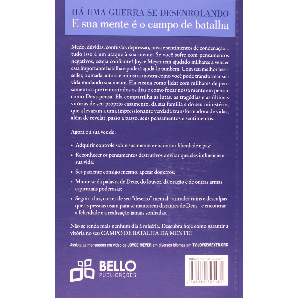 Se você é um dos milhões que sofrem com preocupação, dúvida, depressão, raiva ou culpa, você está experimentando um ataque à sua mente. Superar pensamentos negativos que vêm contra sua mente traz liberdade e paz. Descubra como reconhecer padrões de pensamento prejudiciais e ponha um fim a essa influência em sua vida. Neste poderoso livro, a popular autora e conferencista Joyce Meyer, o conduz através de uma auto-avaliação honesta compartilhando as provações, tragédias e principais vitórias do se u próprio casamento, família e ministério incluído a verdade que ela aprendeu sobre o que estava pensando e sentindo a cada passo do caminho. Você aprenderá como Joyce ganhou a batalha em sua própria mente e como você também pode ganhar.