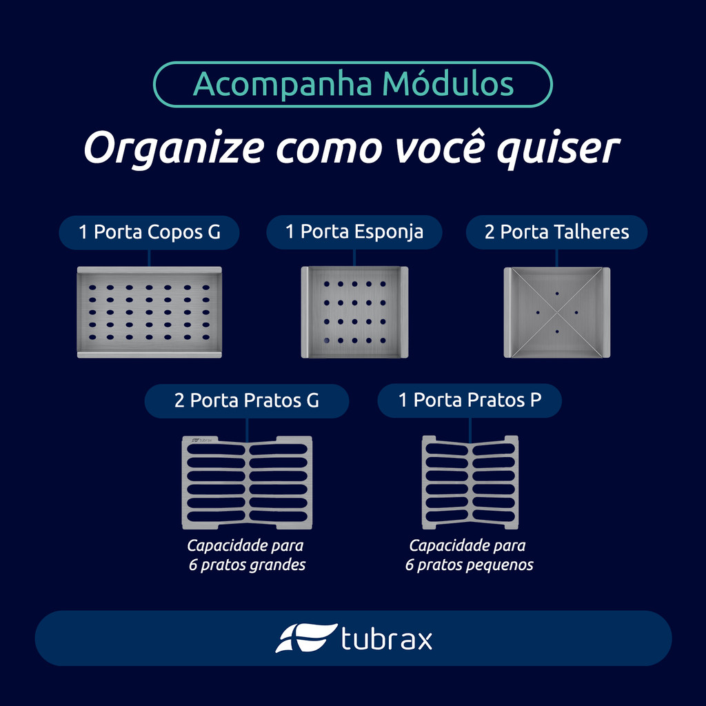 Canal Organizador de cozinha Tubrax - UAC0008-N O Canal Organizador Tubrax com 7 módulos é ideal para quem procura soluções para cozinhas/área gourmet funcionais com um toque de inovação e sofisticação. Produzido em aço inox de alta qualidade, com chapa de 0,8 milímetros de espessura e acabamento acetinado escovado linear, este produto transmite elegância e luxo ao seu ambiente. Acompanham os módulos projetados para perfeita mobilidade (posicione conforme preferir) que possuem encaixe perfeito, auxiliando o processo de lavação e enxague de louças, copos, talheres e utensílios de cozinha. São eles: - 03 módulos para pratos (2 módulos para pratos grandes e 1 módulo para pratos pequenos, com capacidade de 6 pratos cada); - 01 módulo para copos; - 02 módulos com 4 divisórias para disposição de talheres; - 01 módulo para esponja e detergente. Obs: Leves alterações na coloração e acabamento podem acontecer entre diferentes lotes do produto. ESPECIFICAÇÕES TÉCNICAS: - Marca: Tubrax - Referência do Modelo: UAC0008 - Acabamento: Acetinado escovado linear - Material: Aço Inoxidável 304 - Comprimento: 125 cm - Largura: 18 cm - Profundidade: 12 cm - Furo para válvula de 3 1/2" (não incluso) - Peso bruto (com embalagem): 6,3 Kg - Garantia: 3 meses contra qualquer defeito de fabricação.