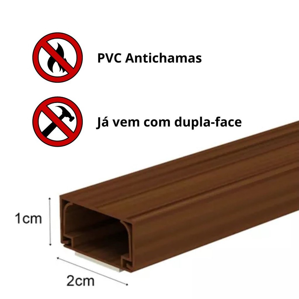 Canaleta 20x10mm com Fita Adesiva (sem divisória) 1 barra de 1 Metro Cor: Mogno (marrom amadeirado) Medidas (Largura x Altura): 20x10mm (2x1cm) Não possui divisória interna Linha: Sistema X PRA QUE A CANALETA SERVE? A canaleta (ou perfil) sistema x autocolante serve para organizar e esconder fios e cabos elétricos na parede, já acompanhando a fita adesiva dupla-face para fixação na mesma. A CANALETA PODE SER USADA PRA FAZER PAINEL RIPADO? Pode ser feito um arranjo na parede com as barras de modo a parecer um painel ripado sim, criando um ambiente limpo e sofisticado em salas e escritórios, residenciais ou comerciais. O único detalhe é que as barras devem ser sempre fixadas na parede, não podendo ficar "em pé", soltas, entre os ambientes, por exemplo. A CANALETA É SEGURA? É "GAMBIARRA"? Sim, as canaletas, além de organizar os fios e cabos elétricos (evitando acidentes e danos físicos e materiais) são feitas de plástico PVC antichamas, não propagando fogo em casos de curto. Não é uma "gambiarra", mas sim uma opção econômica, segura e rápida para não precisar quebrar a parede nem fazer nenhuma obra mais cara e trabalhosa. QUANTOS FIOS CABEM NA CANALETA? A quantidade de fios que cabem dependerá da espessura/bitola dos mesmos. Se forem cabos flexíveis de 2,5mm, por exemplo, caberiam até 6, considerando um espaço razoável entre eles. Caso tenha alguma dúvida específica quanto aos seus cabos basta utilizar o campo de perguntas que analisamos seu caso. BENEFÍCIOS DA CANALETA • Produto de alta resistência; • Design moderno; • Sistema de encaixe leve e suave; • Fácil instalação; • Versátil: adaptável às mais diversas necessidades de instalação: podem ser instaladas na vertical e horizontal; • Não propaga chamas (PVC antichamas); • Instalação rápida e organizada; • Protege e acondiciona melhor o cabeamento; • Elimina frestas e recortes mal feitos da instalação; • Praticidade na instalação sem necessidade de recortes ou chanfros. Marca: Durin Referência: 11242 Código de Barras (EAN): 7908027009248 * Imagens meramente ilustrativas: tonalidade pode variar de acordo com o lote ** Temos a linha completa das canaletas e mata-juntas (conexões e acabamentos) 20x10mm na cor Mogno: para quantidades específicas nos mande uma pergunta que orçamos nas melhores condições para você!