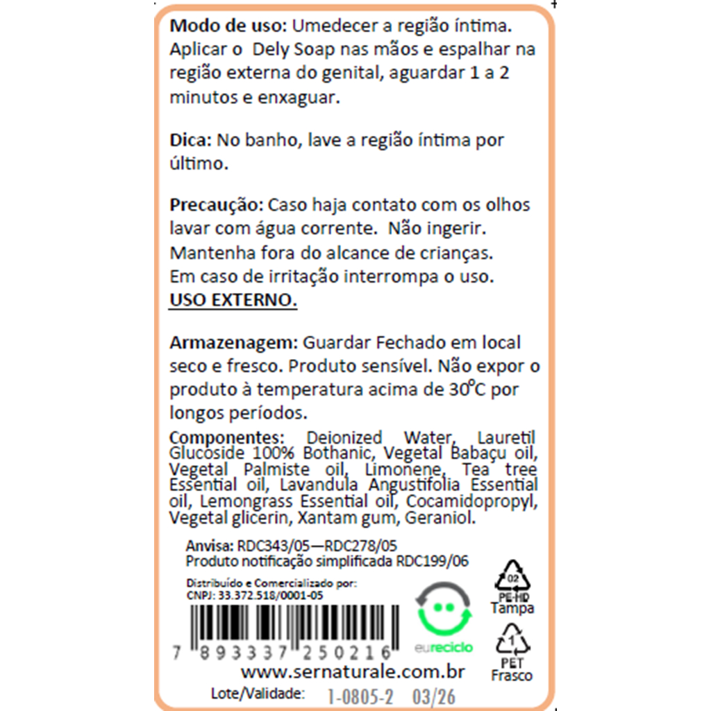 Sabonete Íntimo Dely Soap 200 ml (2 unidades) SERVE PARA HOMENS E MULHERES ============================================================= ATENÇÃO Por que algumas pessoas dizem que o sabonete Dely Soap arde ao usar. A ardência é sinal que você realmente está com candidíase. O fungo da candidíase deixa a pele com pequenos ferimentos e o contato com os ingredientes da fórmula responsáveis por matar o fungo dá essa ardência, que deverá passar após algumas aplicações e o fungo ser morto. Quanto mais grave é o caso de candidíase maior é a ardência. Faça o uso conforme as instruções que você recebeu junto com o produto. Caso desejar, use dia sim dia não, até que a ardência passe. ============================================================= Você quer saber como tratar candidíase na região íntima? *** Temos também um Kit Completo de Tratamento para Candidíase com produtos 100% naturais para casos mais severos. Veja na nossa Loja na Shopee *** Você sabia que candidíase é mais comum do que você imagina? Quase todo mundo um dia teve ou vai ter coceira na região íntima, a chamada Candidíase. O mais incrível de acreditar é que o fungo que causa a candidíase está no corpo de todas as pessoas sem criar problema algum. Mas, por que algumas pessoas sofrem de candidíase e outras não? Na maioria dos casos a candidíase ataca pessoas que estão com a imunidade baixa e estão cometendo algum descuido com a higiene íntima. Como fazer para evitar a candidíase? - Use roupas íntimas de algodão, em especial no verão; - NUNCA deixe sua roupa íntima secar no box do banheiro ou na sombra; - Seque sempre sua roupa íntima no sol ou em secadora com alta temperatura; - Alimente-se com pouco açúcar e massas de farinha branca; - Tome um polivitamínico A-Z 600mg 60 cápsulas ao menos 2x ao ano; - Nunca use sabonetes comuns, eles são agressivos; - Higienize SEMPRE a região íntima após o ato sexual; - Muito cuidado com o uso contínuo de antibióticos, eles destroem sua imunidade. A candidíase é causada por fungos que se alojam na região íntima, por ser um local úmido e escuro. Esses fungos se alimentam da queratina da pele úmida e sensível da região genital. O mais comum é Cândida Albicans, um fungo naturalmente encontrado em várias partes do corpo, sendo mais frequente na mucosa vaginal de mulheres e região íntima dos homens. O sintoma mais comum é a coceira na região íntima. O Kit de Cuidado Íntimo é um tratamento completo para acabar de vez com os fungos e com o incômodo da coceira. O Sabonete Íntimo Dely Soap é 100% natural, feito com ingredientes da natureza, sem corantes, sem conservantes artificiais e sem Lauril Sulfato de Sódio. O Lauril Sulfato de Sódio é um componente feito a partir do petróleo que é muito irritante para a região genital. Evite sabonetes com Lauril, quase todos tem. O Dely Soap é 100% livre de Lauril Sulfato de Sódio. Modo de uso: USAR DIARIAMENTE Sabonete Dely Soap • Umedeça a região genital e as mãos, • Aplique na região genital externa usando as mãos, • Aguarde em torno de 1 minuto ou mais, • Enxágue. Ficamos à disposição. Muito obrigada Ser Naturale cosméticos naturais