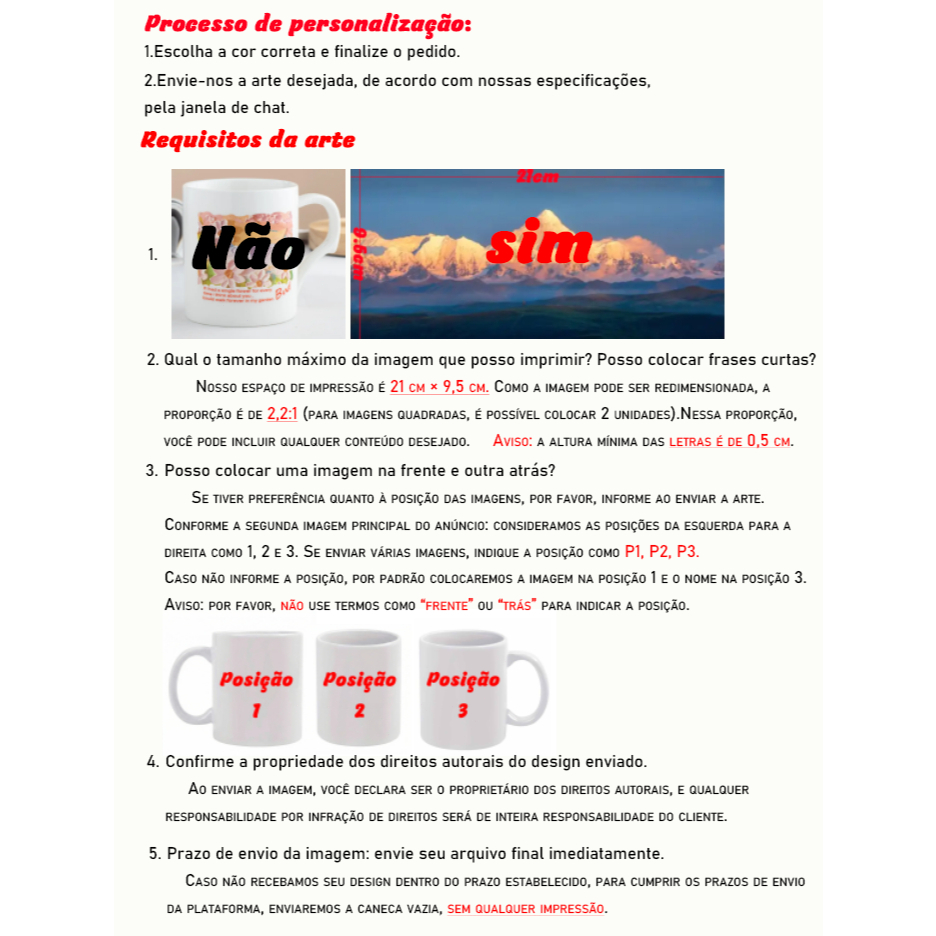 🌸Caneca 325ml Mudar Cores Personalizada com Fotos, Nome,Texto Porcelana Premium 🌸 💖Revela a imagem ao colocar liquido quente.💖 Todos os desenhos do produto são impressos em alta definição sob medida, e não são adesivos comuns nem gravações a laser. A imagem fica integrada ao produto, com superfície lisa, resistente, não sai com facilidade, melhor textura e maior durabilidade. Agradecemos a sua confiança e esperamos apresentar uma criação que atenda às suas expectativas! Quando a imagem for confirmada como correta, os pedidos fechados até as 12h do meio-dia serão expedidos no mesmo dia. Requisitos de impressão: (1) Requisitos de formato da imagem: É recomendado fornecer a imagem com dimensões de 210 mm (largura) x 96 mm (altura). Caso o padrão fornecido seja de outra dimensão, será necessário realizar recortes e ajustes para se adaptar à área de impressão, e é possível que a imagem não cubra toda a caneca. A Figura 3 é o efeito de impressão de referência. (2) Requisitos de formato do texto: É recomendado que a altura do texto adicionado não seja inferior a 5 mm. Pois textos muito pequenos podem perder nitidez. Ao realizar o pedido, você concorda automaticamente com o efeito final da imagem impressa. (3) Direitos autorais: Confirme a posse dos direitos autorais do design enviado. Ao submeter a imagem, você declara ser seu titular, e toda responsabilidade por violações de direitos recai sobre o cliente. (4) Serviço de design: Não oferecemos serviço de criação de padrões. Devido à alta demanda de trabalho e ao nosso foco na produção, nos dedicamos à reprodução precisa da sua ideia criativa. (5) Horário de envio da imagem: Por favor, envie imediatamente o seu arquivo final. Caso não recebamos o seu design dentro do prazo, para cumprir os requisitos de expedição da plataforma, enviaremos uma caneca vazia, sem nenhuma impressão. (6) Pré-visualização antes da produção: Não fornecemos pré-visualizações antes da produção. Essa medida acelera nosso fluxo de trabalho, integra o arquivo diretamente e garante entrega mais rápida. Se tiver dúvidas sobre a aplicação do design no produto, entre em contato conosco antes do pedido — podemos analisar o arquivo e dar sugestões. (7) Uma vez que o pagamento é feito, não pode ser modificado. Se você precisar alterar o endereço de entrega ou informações de entrega, por favor, cancele o pedido e faça um novo pedido.