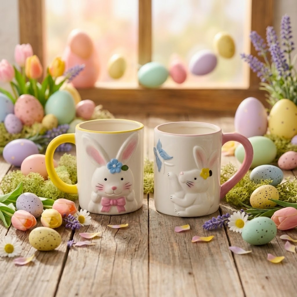 Caneca Coelho Páscoa 330ML Cerâmica Decorada Coelhinho Xícara Branca Café Chá Chocolate