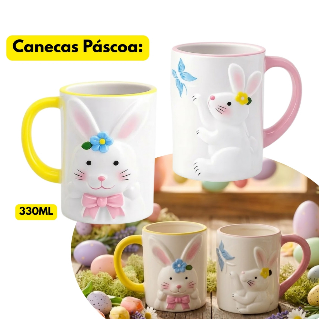 | Caneca Coelho Páscoa 330ML Cerâmica Decorada Coelhinho Xícara Branc... este produto | R$ 27,99 | 39% | 4.9/5 | — |