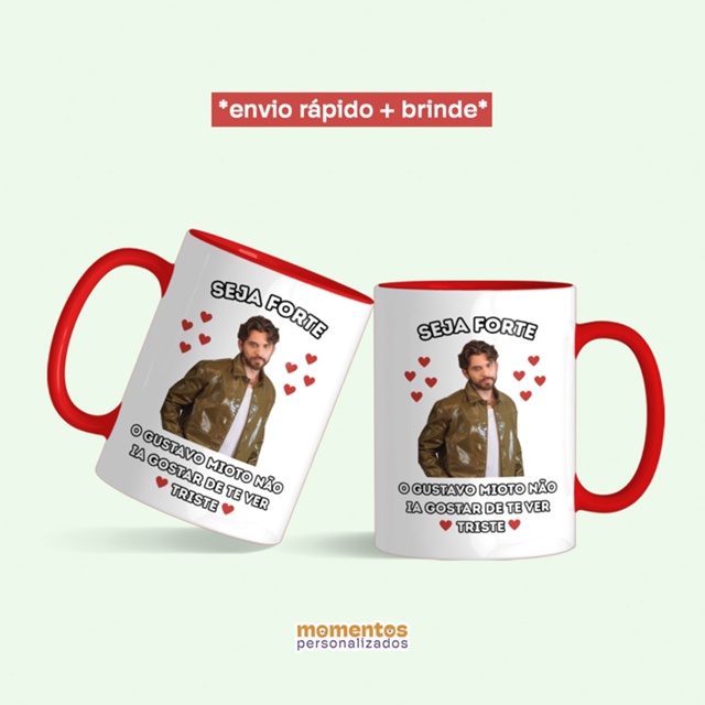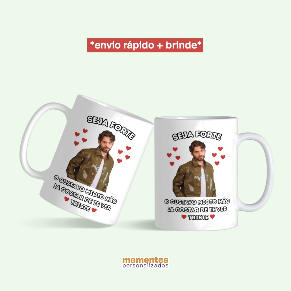 *ENVIO RÁPIDO* + * apoio de celular brinde * Somos a Momentos Personalizados, e transformamos momentos únicos e especiais em lembranças personalizadas! Caneca: Seja Forte - o Gustavo Mioto não ia gostar de ter triste Perfeita para se auto presentear ou presentear aquele fã especial <3 Sobre o Produto: - Caneca em cerâmica de alta qualidade, garantindo uma maior durabilidade e resistência; - Formato cilíndrico, com capacidade de 325ml e dimensões de 9,5 x 8,2cm; - Feita a partir do método de sublimação, com alta qualidade de impressão; - Quantidade da embalagem: 01 unidade; * As cores podem sofrer pequenas alterações conforme a resolução e configuração do seu celular/tablet/monitor. Sobre o envio: - Enviamos para todo Brasil; - Após a confirmação do pagamento, enviaremos com prazo de 1 dia. - Envios são feitos somente em dias úteis. Em caso de dúvidas, estamos a disposição.