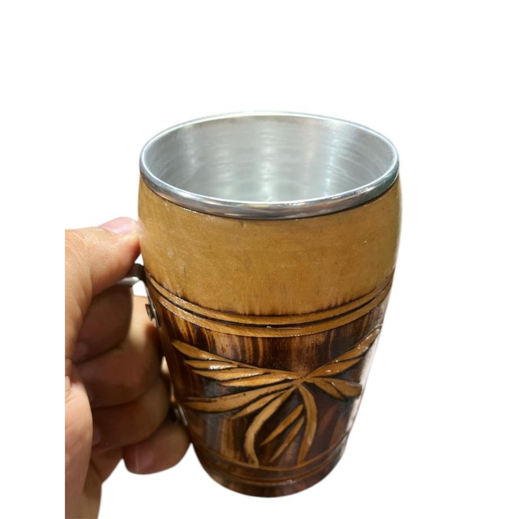Caneca de madeira com copo de alumínio. - Alça metálica - Capacidade para 300 ml - Bebidas quentes ou geladas - Peça decorativa, artesanal - Medidas do produto: 14 cm de altura/9 cm de diâmetro