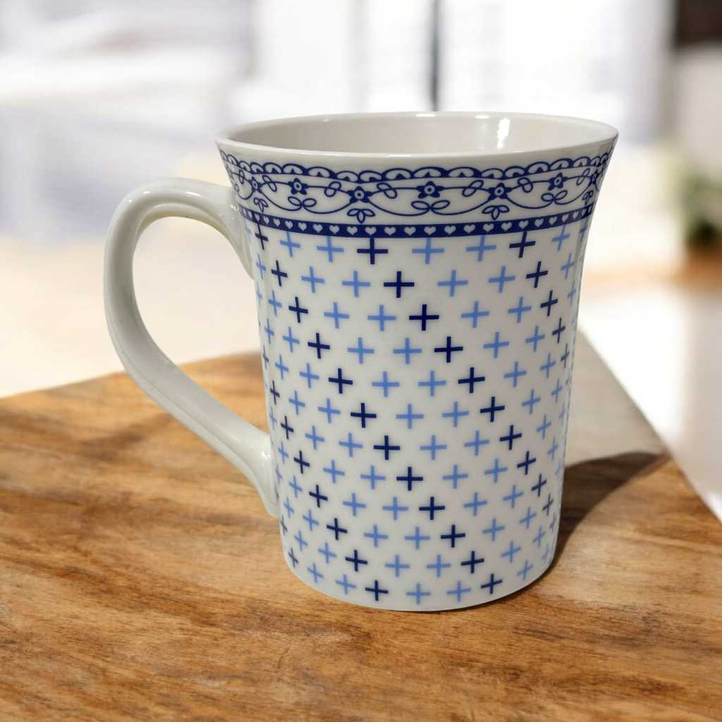 Caneca de Porcelana Estampada 350 ml | Estilo Geométrico Azul e Branco