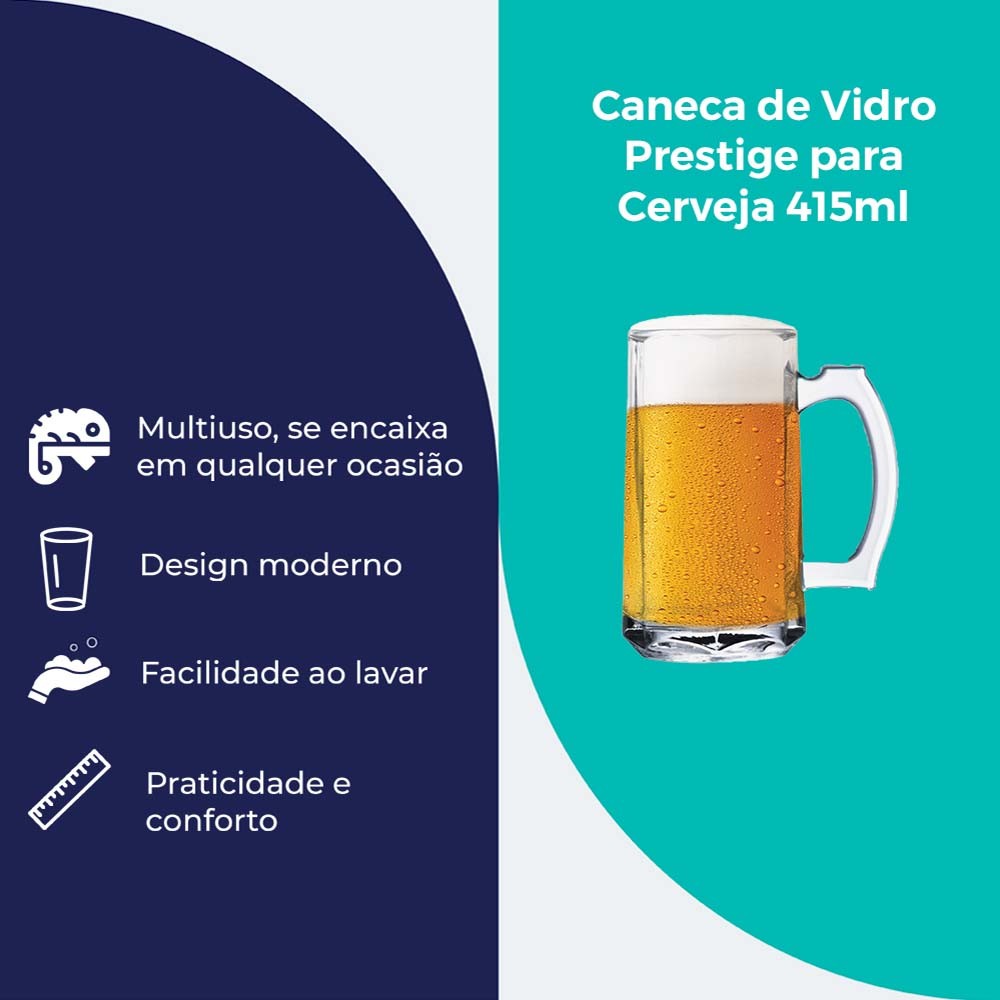 A Caneca de Vidro Prestige para Cerveja é a escolha perfeita para os apreciadores de uma boa cerveja. Com capacidade de 415ml, ela oferece o equilíbrio ideal entre tamanho e estilo, permitindo que você saboreie sua bebida favorita com sofisticação. Seu design elegante e atemporal traz um toque de classe ao momento de degustação, enquanto a alta qualidade do vidro garante durabilidade e resistência. Esta caneca de vidro realça a cor, o aroma e o sabor da cerveja, proporcionando uma experiência completa e prazerosa. Ideal para festas, reuniões ou para o seu momento relaxante após um longo dia, a Caneca de Vidro Prestige combina funcionalidade com um visual sofisticado, transformando qualquer ocasião em uma celebração de estilo. Uso: Chopp. Material: Vidro. Diâmetro: 74mm. Altura: 144mm. Capacidade: 415ml. Conteúdo da Embalagem: 1 Peça. - Peça medida com o volume máximo até a boca - Diâmetro é medido pela largura maior da peça. - Pode sofrer variação de até 10% de seu volume. Dica de uso e preservação: • Recomendamos que a limpeza da peça seja feita a mão para evitar quebras ou danos. • Limpe a sujeira utilizando uma esponja macia, tire o resíduo de sabão e seque bem. • Não utilize abrasivos ou utensílios pontiagudos. • Evite impactos e não exponha o vidro a mudanças bruscas de temperatura pois poderá causar choque térmico e danificar seu produto. • Para realçar ainda mais o brilho das peças, limpe-as com uma flanela que não solte fiapos, levemente umedecida com álcool.
