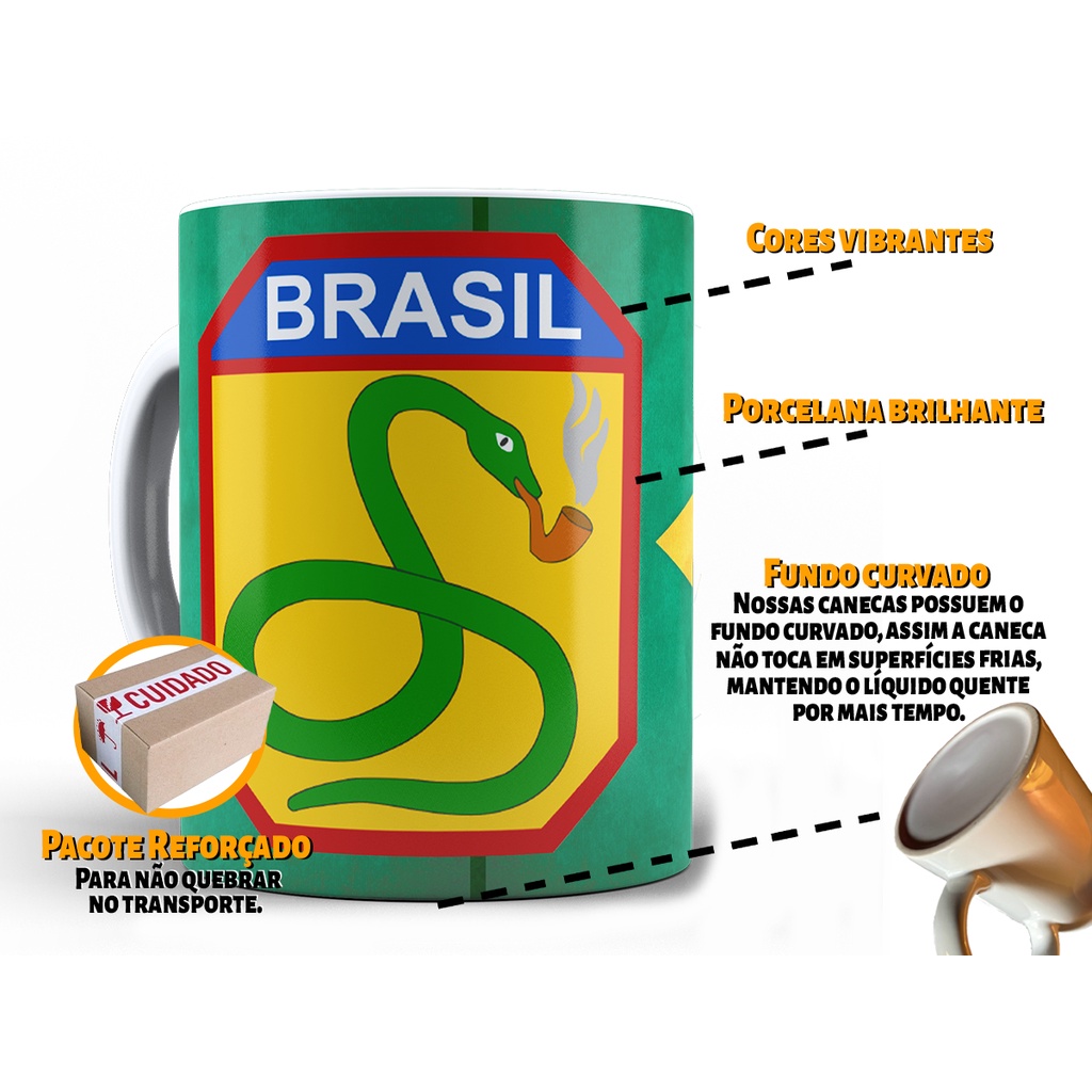 Loja Rei Caneca - Compra segura e Envios rápidos Caneca Força expedicionária brasileira (FEB) Caneca perfeita para usar ou presentear aquela pessoa especial. Nossas canecas são produzidas com qualidade máxima! Podem ir ao micro-ondas e lava-louças sem problemas. Medidas e material: - Material: Porcelana durável - Capacidade: 325ml - Altura: 10cm - Diâmetro: 8,2cm Incluso no pacote: 1x Caneca 1x Caixinha presente 1x Brinde