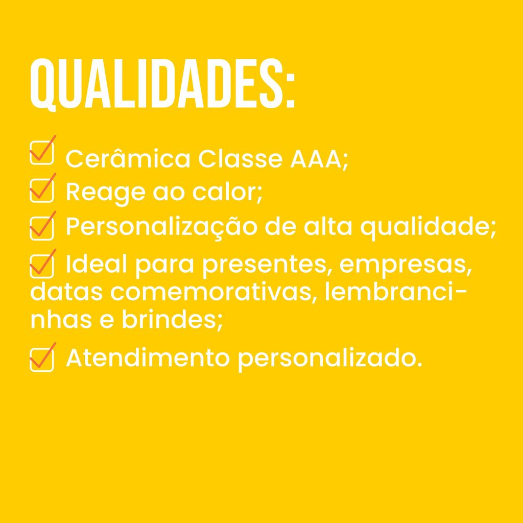 Transforme qualquer foto, frase ou logo em uma surpresa inesquecível com a Caneca Mágica Personalizada (térmica)! À primeira vista ela é preta, mas ao adicionar uma bebida quente a estampa aparece como mágica, criando aquele efeito “uau” perfeito para presentear ou destacar sua marca. Com capacidade de 325 ml, é ideal para café, chá e outras bebidas quentes. Destaques e Vantagens: - Efeito mágico térmico: a caneca muda de cor com o calor e revela a personalização. - Personalização exclusiva: você escolhe foto, arte, frase, nome ou logo. - Cerâmica Classe AAA: acabamento de alta qualidade e ótima apresentação. - Impressão de alta definição: cores vivas e boa durabilidade no uso do dia a dia. - Presente criativo e impactante: ideal para datas comemorativas, lembrancinhas, brindes e empresas. - Atendimento personalizado: suporte para garantir que sua arte fique como você imaginou. Especificações Técnicas: - Tipo: Caneca mágica (térmica) - Material: Cerâmica Classe AAA - Capacidade: 325 ml - Altura: 9,5 cm - Diâmetro: 8 cm - Efeito térmico: revela a arte com bebida quente Benefícios para Você - Surpresa garantida: efeito visual que chama atenção e gera lembrança. - Versátil: perfeita para uso pessoal, presente e ações promocionais. - Valor para marcas: excelente como brinde premium para eventos e kits corporativos. Cuidados para sua Caneca Durar Muito: - Lave à mão, com o lado macio da esponja. - Evite micro-ondas e lava-louças (para preservar o efeito térmico e a estampa). - Não use abrasivos ou palha de aço.