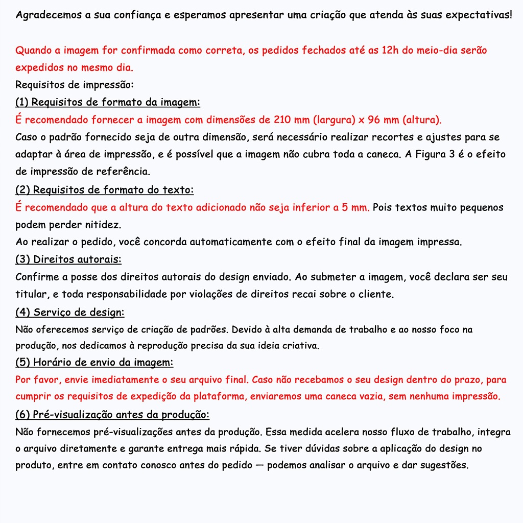 Todos os desenhos do produto são impressos em alta definição sob medida, e não são adesivos comuns nem gravações a laser. A imagem fica integrada ao produto, com superfície lisa, resistente, não sai com facilidade, melhor textura e maior durabilidade. Agradecemos a sua confiança e esperamos apresentar uma criação que atenda às suas expectativas! Quando a imagem for confirmada como correta, os pedidos fechados até as 12h do meio-dia serão expedidos no mesmo dia. Requisitos de impressão: (1) Requisitos de formato da imagem: É recomendado fornecer a imagem com dimensões de 210 mm (largura) x 96 mm (altura). Caso o padrão fornecido seja de outra dimensão, será necessário realizar recortes e ajustes para se adaptar à área de impressão, e é possível que a imagem não cubra toda a caneca. A Figura 3 é o efeito de impressão de referência. (2) Requisitos de formato do texto: É recomendado que a altura do texto adicionado não seja inferior a 5 mm. Pois textos muito pequenos podem perder nitidez. Ao realizar o pedido, você concorda automaticamente com o efeito final da imagem impressa. (3) Direitos autorais: Confirme a posse dos direitos autorais do design enviado. Ao submeter a imagem, você declara ser seu titular, e toda responsabilidade por violações de direitos recai sobre o cliente. (4) Serviço de design: Não oferecemos serviço de criação de padrões. Devido à alta demanda de trabalho e ao nosso foco na produção, nos dedicamos à reprodução precisa da sua ideia criativa. (5) Horário de envio da imagem: Por favor, envie imediatamente o seu arquivo final. Caso não recebamos o seu design dentro do prazo, para cumprir os requisitos de expedição da plataforma, enviaremos uma caneca vazia, sem nenhuma impressão. (6) Pré-visualização antes da produção: Não fornecemos pré-visualizações antes da produção. Essa medida acelera nosso fluxo de trabalho, integra o arquivo diretamente e garante entrega mais rápida. Se tiver dúvidas sobre a aplicação do design no produto, entre em contato conosco antes do pedido — podemos analisar o arquivo e dar sugestões. Por se tratar de um produto personalizado, não aceitamos devoluções. Crie sua própria caneca personalizada com nome, foto, logo ou frase! Crie um presente único e inesquecível! Nossa caneca de porcelana personalizada 325ml é perfeita para casamento, aniversário, eventos corporativos e lembrancinhas em geral. Como Personalizar: 1.Faça seu pedido normalmente 2.Envie a sua ideia, imagem, nome, logo ou frase via chat imediatamente após o pagamento! 3.Tamanho da área sublimável 210mmx96mm (podendo haver variação para menos de acordo com a sua arte). AVISO: A altura dos caracteres não deve ser inferior a 5 mm. As imagens não podem infringir direitos autorais. Nós não criamos imagens, so vai produziremos conforme as imagens que você enviar. Caso não seja enviado nenhuma informação para personalização seu pedido será enviado sem arte , pois temos prazo de envio . Não enviamos arte para aprovação , se desejar combine antes em nosso chat essa possibilidade. Transforme suas ideias em um presente criativo, único e cheio de personalidade! Seja para uso próprio, presente ou brindes corporativos, nossas canecas personalizadas encantam em cada detalhe. Detalhes do Produto: Caneca de porcelana branca premium Capacidade de 300ml a 325ml Estampa frente e verso Tamanho da área sublimável 210mmx96mm (podendo haver variação para menos de acordo com a sua arte). Pode ir ao micro-ondas e lava-louças Impressão em sublimação de alta qualidade – não desbota e não descasca Personalizamos com foto, nome, frase ou logotipo, usando sublimação de alta qualidade, garantindo cores vivas e longa durabilidade. Personalização feita no mesmo dia (envio rápido!) Sugestões de uso: Presentes de aniversário Caneca corporativa com logo Caneca com frase engraçada ou inspiradora Caneca temática: personagens, datas especiais, nomes personalizados ,Brindes para eventos, casamentos, maternidade, chá revelação, aniversário Impressão resistente (não desbota) Pode ir ao micro-ondas e lava-louças Acabamento profissional caneca personalizada,caneca porcelana,caneca 325ml,lembrancinha,presente criativo,caneca com foto,caneca com nome,caneca empresa,caneca casamento,caneca aniversário,sublimação Cuidados: Pode lavar normalmente com o lado amarelo da esponja Suporta micro-ondas e lava louças Evite produtos abrasivos para maior durabilidade,