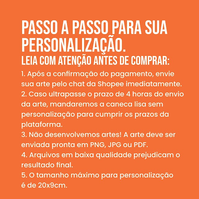 Transforme uma ideia em um presente único! Nossa caneca de porcelana (325 ml) tem acabamento premium e estampa com cores vivas. Perfeito para café, chá e para divulgar sua marca, frase ou foto preferida. Antes de comprar (importante!) - Não criamos a arte. Você precisa enviar sua arte logo após a compra. - Se a arte não for enviada até nosso horário de corte, o pedido pode ser postado com a caneca em branco para não perder o prazo. Como enviar a arte - Envie uma imagem em PNG ou JPG/JPEG. PDF não é aceito. - Tamanho da imagem: 20 cm (largura) x 9 cm (altura). - Pode enviar como imagem no chat da compra ou por link (Drive, Canva, Dropbox, etc.). - Dica: deixe textos e logos um pouquinho afastados das bordas para não cortar. Por que você vai amar - Personalização do jeitinho que você quiser (foto, frase, logotipo). - Porcelana de alta qualidade: elegante e ótima para apresentar. - Estampa nítida e duradoura. - Vai ao micro-ondas e à lava-louças. - Presente criativo para qualquer ocasião. Detalhes do produto - Material: porcelana - Capacidade: 325 ml - Altura: 9,5cm | Diâmetro: 8 cm - Estampa resistente ao uso no dia a dia Observação: pequenas diferenças de cor podem ser causadas pela tela do celular/computador. Envie sua arte o quanto antes após a compra para agilizar a postagem.