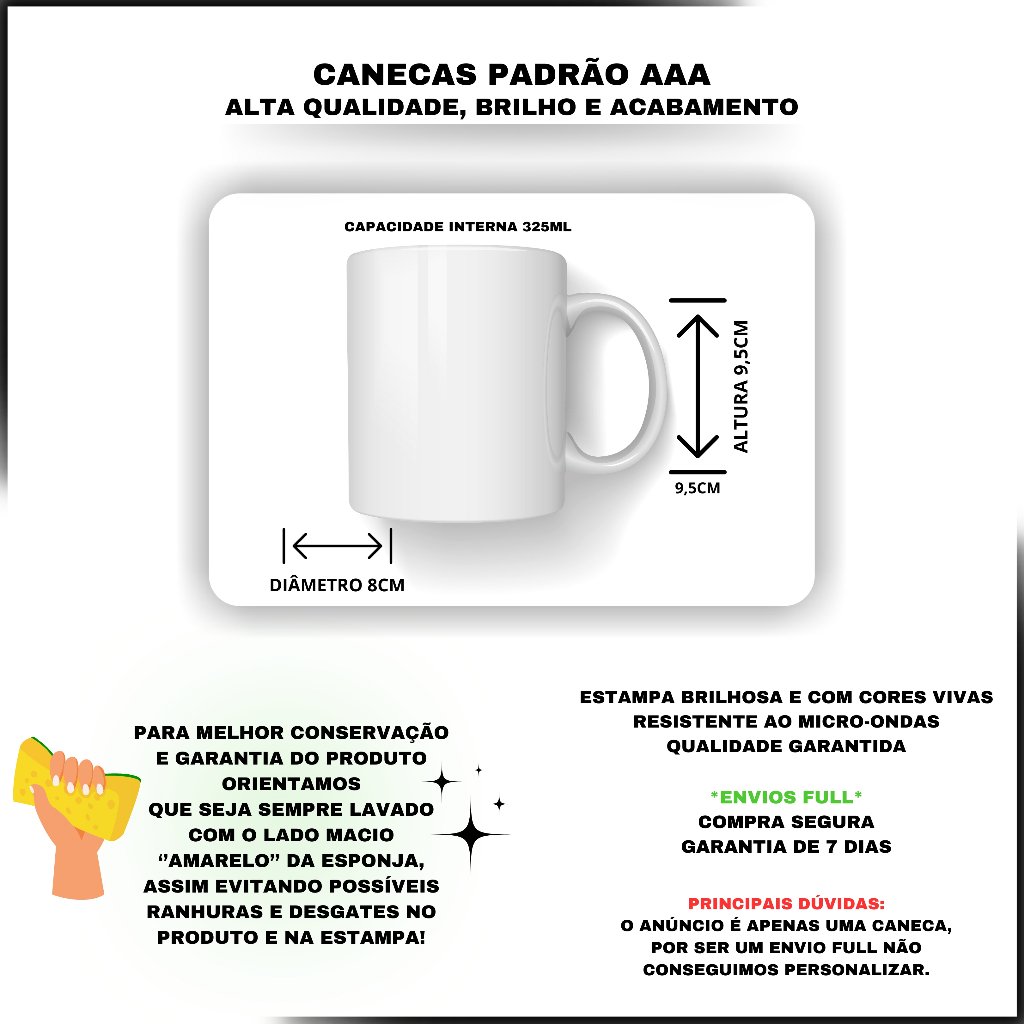 Bem vindo a Palizza! CASO ESCOLHA A OPÇÃO ENVIAR NOME NO CHAT, O NOME DEVE SER ENVIADO NA MESMA HORA DA COMPRA, CASO CONTRARIO SERÁ ENVIADO SEM NOME" Para você que é fã de verdade chegou a caneca PERFEITA! Pronta para o seu dia a dia ou para ficar exposta na sua coleção! O presente ideal para aquela pessoa que você adora. Nossa caneca de Porcelana é de classe AAA (PREMIUM), nosso setor de qualidade cuida para que o seu produto seja feito e embalado com ALTA QUALIDADE que somente a Palizza tem! Pode ser levada ao micro-ondas, e para melhor conservação da caneca orientamos que seja lavada a mão com o lado macio da esponja, e não seja colocada na lava-louças. Informações do produto: Material: Porcelana Capacidade: 325 ml Altura: 9,5cm Diâmetro: 8cm Para ver outras inúmeras variedades de canecas clique em "Ver loja".