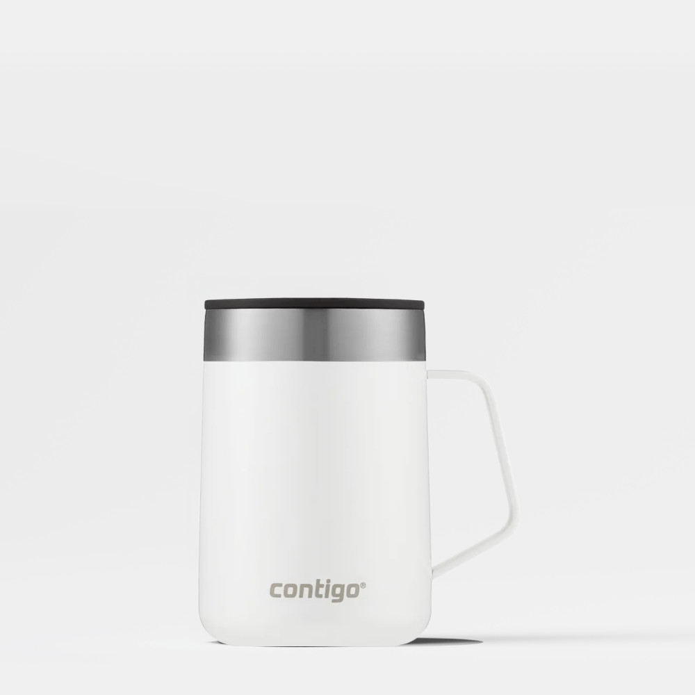 A Caneca Térmica Street Branca Contigo | 414ml, combina a praticidade de manter bebidas quentes ou frias por horas com um design sofisticado em cores metálicas chamativas. As bebidas permanecem quentes por até 5 horas ou frias por até 15 horas, perfeitas para tomar café enquanto trabalha em casa ou dá uma volta rápida pelo bairro. A alça confortável torna a hora de tomar suas bebidas favoritas mais agradável e a tampa à prova de respingos mantém sua bebida dentro da caneca quando fechada. O fundo emborrachado é antiderrapante e ajuda a evitar que a caneca escorregue, faça barulho ou risque as superfícies, para que você se sinta confiante ao colocá-la sobre qualquer superfície. A caneca cabe convenientemente na maioria das máquinas de café. Tanto o corpo quanto a tampa podem ir na prateleira superior da lava louças. Principais característicasAlça em aço inoxidável elegante que permite beber com mais facilidadeTampa à prova de respingosTanto o corpo quanto a tampa podem ir na prateleira superior da lava louçasFundo emborrachado, antiderrapante, ajuda a evitar que a caneca escorregue ou risque as superfíciesLivre de BPA; Conserva por mais tempoBebidas quentes por até 5 horasBebidas frias por até 15 horas Garantia12 meses Capacidade414 ml Cuidados e manutençãoLavar bem antes de cada uso;Deslize a tampa para abrir antes de enxaguar ou lavar;A tampa e o corpo em aço inoxidável são seguros para ir na prateleira superior de sua lava louças;Sempre guarde a caneca com a tampa removida para permitir que as partes sequem completamente. Conteúdo da embalagem1 Caneca Térmica Street Branca1 Manual