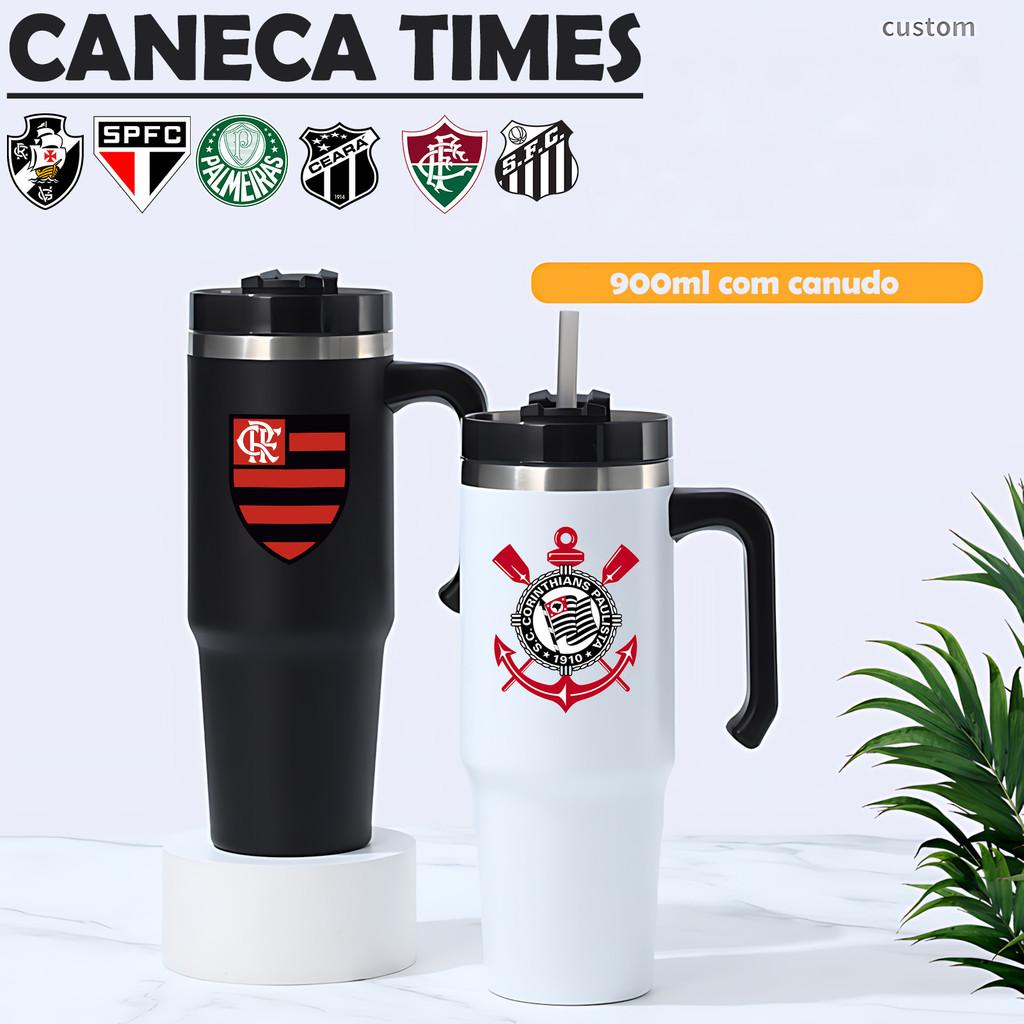 Caneca times Unick Térmica Inox 900ML Inoxidável com tampa e canudo futebol HONG