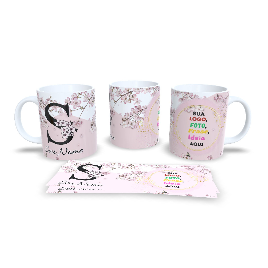 Caneca Xícara Feminina Porcelana Floral Cerejeira Personalizada Nome e Frase