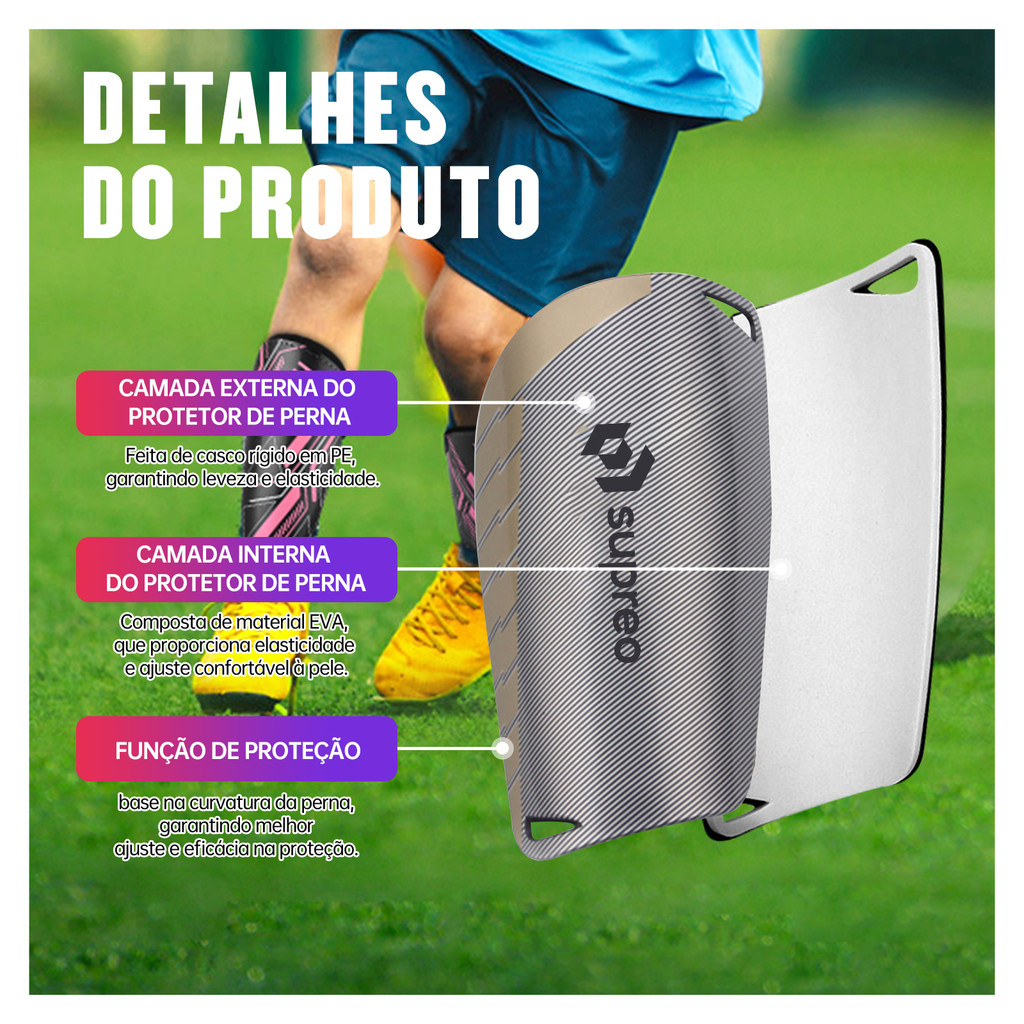 Garanta máxima proteção e conforto com o Protetor de Canela Supreo, projetado para jogadores de todas as idades e níveis! Desenvolvido com materiais de alta qualidade, ele combina leveza, resistência e ergonomia para que você tenha o melhor desempenho em campo. Por que escolher o Protetor de Canela Supreo? - Três tamanhos para ajuste perfeito: - Pequeno (10-13 anos | Altura: até 140cm) - Médio (14-17 anos | Altura: 160-175cm) - Grande (18+ | Altura: 175-190cm) - Proteção superior: Placa de PE rígida e leve, moldada para se ajustar à curvatura da perna, oferecendo estabilidade e absorção de impactos. - Conforto incomparável: Camada interna em EVA macio e elástico, garantindo proteção contra choques e atrito com a pele. - Alta resistência: Material durável que suporta até os jogos mais intensos. Benefícios: ✅ Design ergonômico que acompanha o formato da perna. ✅ Leveza e elasticidade para máximo desempenho. ✅ Conforto duradouro sem causar irritações. ✅ Ideal para treinos, jogos e competições. Especificação: Marca: Supreo Nome do produto: Caneleira de futebol Medidas: Pequeno (15cm x 8,5cm), Médio (17cm x 8,5cm) e Grande (19cm x 10cm) Material: Placa de PE + Camada de EVA 📦 O Que Acompanha: 2 x Canaleira de futebol