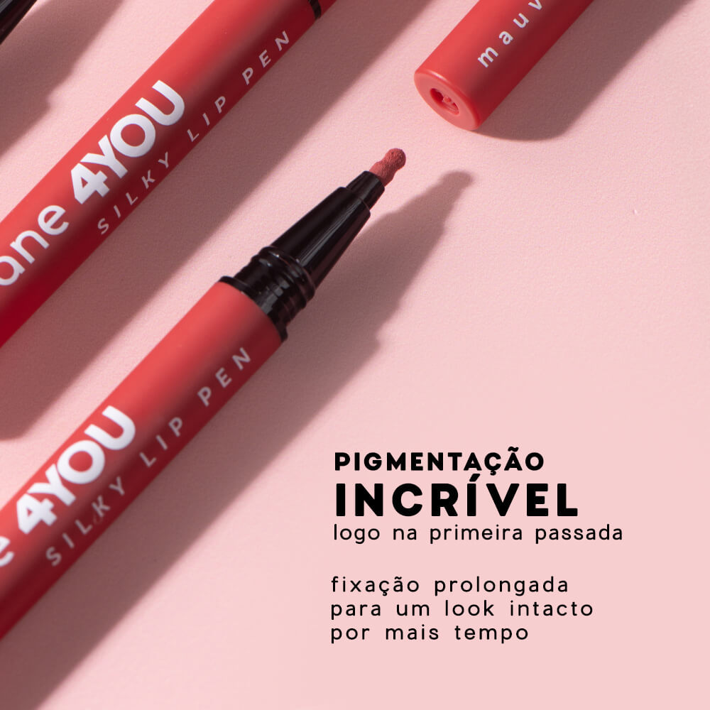 Quando o Assunto É Maquiagem, Sua Boca Merece Destaque, Não Acha? Quem Ama Experimentar Produtos de Beleza Diferentes, Que Dão Aquele Up No Visual, Precisa Conhecer o Silky Lip Pen, da Linha 4you. Ele Vem em Formato de Caneta, Que Facilita a Sua Vida Na Hora da Aplicação. Quer Praticidade? Então Vem com a Gente! O Silky Lip Pen Tem Uma Ponta Fina para Delinear Os Lábios, Fazer Um Contorno Labial Perfeito e Preencher a Boca com Muita Precisão. a Textura Líquida É Super Pigmentada, Então Já Garante Uma Cor Maravilhosa de Primeira! Tem Fixação Prolongada e Dura Muito. Imagina Só Uma Boca com Cor Uniforme e Bem Definida? com Ele, Você Vai Passar Seu Batom Matte sem Medo de Errar. E a Cor Mauve É Discreta e Elegante. Esse Tom de Rosa Mais Claro Combina Perfeitamente com Diversos Estilos de Make e Tem Tudo para Se Tornar Um Hit Na Sua Rotina de Beleza. Então Bora Conhecer o Silky Lip Pen! E Outra Coisa Muito Legal: Esse Batom em Caneta É Vegano e Cruelty Free. Um Produto com Tantos Benefícios Não Vai Sair do Seu Nécessaire! Como Posso Variar o Uso do Silky Lip Pen? Quer Criar Visuais Diferentes Usando o Seu Silky Lip Pen? Você Pode Fazer Isso. com Um Gloss Incolor Por Cima do Batom, Você Dá Um Acabamento Brilhante Lindo para a Sua Boca. e Se Você Optar Por Uma Tonalidade Mais Clara para Passar No Centro da Boca, É Possível Fazer Um Efeito Ombré Lips Sensacional. Como Eu Faço para o Meu Batom Durar Ainda Mais Tempo? Se Você Quer Fazer o Seu Batom Durar Muito Tempo, a Gente Te Dá Umas Dicas de Milhões: - Deixe Seus Lábios Sempre Muito Bem Hidratados; - Um Contorno Labial É Sempre Bom; - Passe Uma Camada do Seu Batom; - Remova o Excesso do Batom com Um Papel Toalha; - Volte com Outra Camada de Batom; - Aplique Uma Camada Fina de Pó Solto para Selar o Batom; - Venha com Um Fixador de Maquiagem.