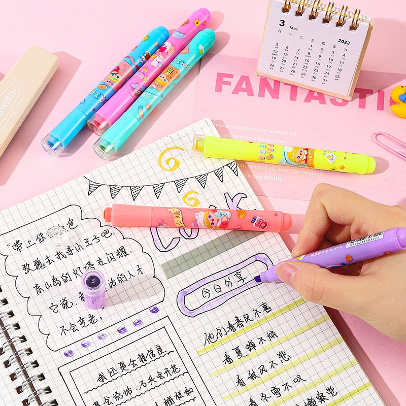 Caneta Carimbo + Marca texto 6 Cores Criativa MODELO Garota com Coelho Fofa Neon Baratos
