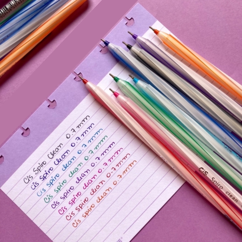 As canetas esferográficas CIS Spiro tem o corpo listrado na cor da tinta, são macias para escrever, e a tinta tem boa pigmentação. Corpo mais longo que as canetas tradicionais. 17,5 cm. Ponta tipo agulha 0.7mm.