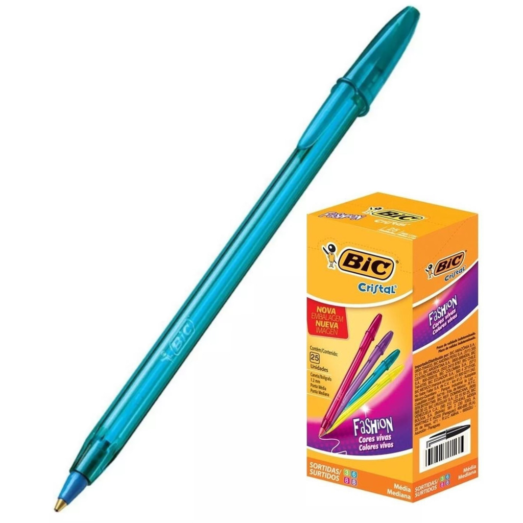 **Informações constantes do selo, conforme Portaria Inmetro Nº 333/2012:** Segurança, Compulsório, Registro 003223/2012, SGS0040, INMETRO **Especificações técnicas:** Marca: BIC Referencia: 902474 Codigo: 59994 Cores: azul celeste, verde claro, rosa e roxa Embalagem: Caixa Com 25 Unidades Sortidas **Descrição:** Caneta esferográfica BIC Cristal Fashion é ideal para quem quer sair da rotina! Disponível em cores vibrantes e ponta média 1.2mm. As canetas esferográficas BIC Cristal Fashion tem ponta média e escrita intensa, que proporciona maciez e um deslizar ultra fácil. Possui tampa ventilada que garante a segurança do produto. Disponível em cores vibrantes.