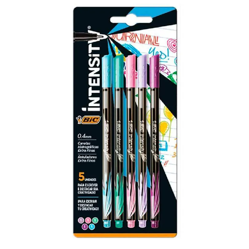 Transforme palavras em arte com a linha Intensity da Bic! Dual Tip / 2 Pontas: Caneta Hidrográfica BIC Intensity Ponta Dupla Pncel Brush Pens é ideal para Lettering. A linha Intensity inovando sempre, lançou a caneta hidrográfica ponta pincel. Sua ponta flexível e resistente é ideal para dar efeito pincel nas suas artes. Indicada especialmente para para os artistas Lettering, permite traço fino ou grosso de acordo com a pressão usada. Seu corpo grosso permite um melhor manuseio. Solte sua imaginação! 5 Cores Básico / 5 Cores Pastéis: Caneta Hidrografica Ultra fina 0,4mm BIC Intensity com tinta à base de água que não marca a folha de trás. A Intensity é definida pela BIC como canetas premium com ponta de feltro ultrafina de 0,4 mm, o que garante um desempenho inigualável tanto na escrita, com cores vivas para destacar pontos importantes do texto, quanto em projetos manuais e lettering, modalidade que mescla arte, design e diferentes tipografias, oferecendo um acabamento diferenciado e cores vibrantes. Brush Ponta Dupla: A caneta Bic intensity dual tip é uma ferramenta 2 em 1 com uma ponta fina em uma extremidade e uma ponta de pincel na outra. É ideal para escrita criativa, coloração de adultos e diários, com tinta à base de água em cores pastel. Perfeito para entusiastas de lettering e bullet journal. Pontas resistentes. ponta volta sempre ao formato original após pressionada, efeito pincel ideal para lettering, faz traço fino ou grosso de acordo com a pressão usada. Tinta não seca mesmo com tampa aberta por até 3 meses.
