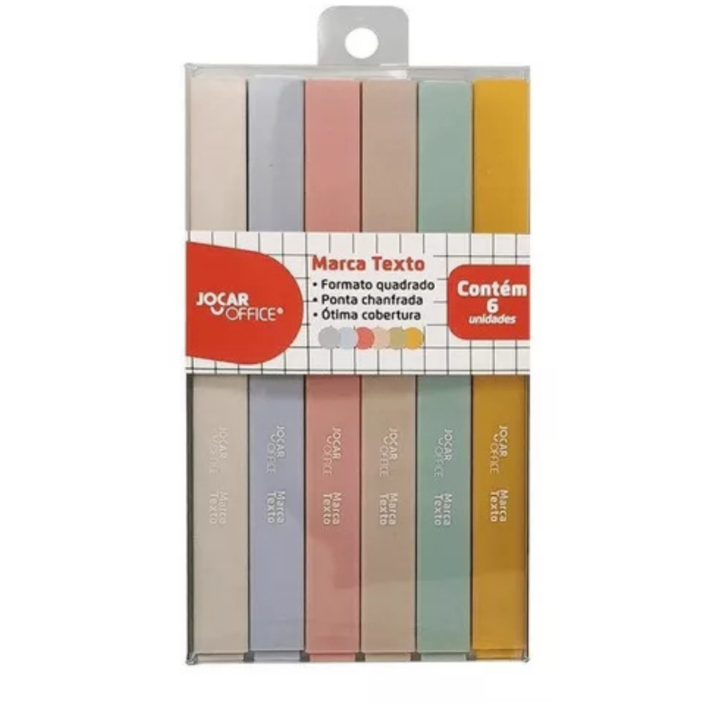 Marca Texto Jocar Office Formato Quadrado C/6unid 6 Peças/conjunto Joccar Office Caneta Marca Texto As canetas marca-texto Jocar Office vão tornar sua vida mais colorida e organizada. São 6 cores inspiradas nas tonalidades mais utilizadas em planilhas, ideais para marcação de texto em relatórios e trabalhos escolares ou profissionais. Com design retangular moderno e pontas chanfradas, proporcionam precisão no traço. Especificações: - Marca: Leonora - Ponta: Chanfrada - Traço: 1-6mm - Dimensões: Altura de 14,5cm x 2,6cm Largura - Composição: Corpo em resina termoplástica, polipropileno, ponta de fibra e tinta à base de água e corantes.