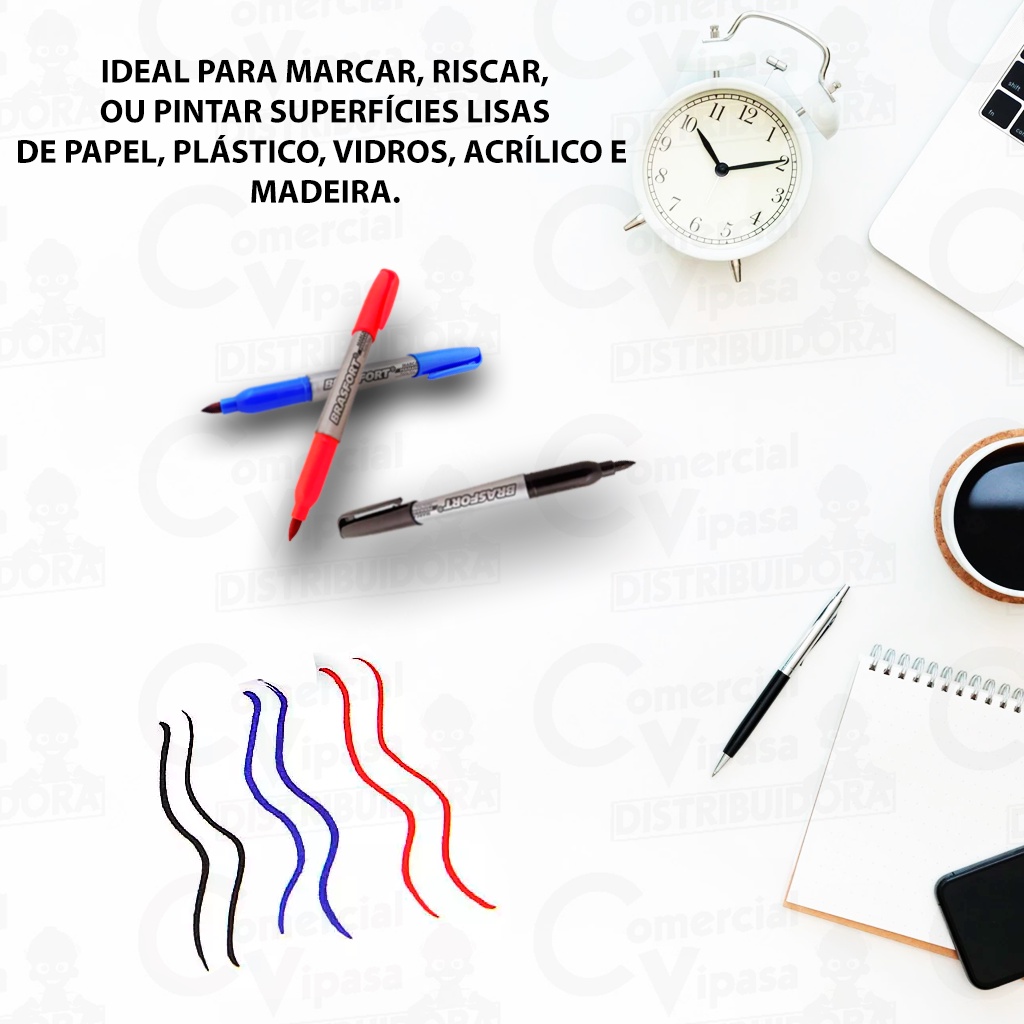 COMERCIAL VIPASA DISTRIBUIDORA. Descrição Do Produto Para metal, vidro, papel, pisos, revestimentos e plástico. - Secagem Rápida - Não Tóxica - Baixo Odor - Resistente à água - Composição: Polipropileno(PP Ponta: fina 2mm Descrição Do Produto CANETA MARCADORA PERMANENTE PONTA FINA BRASFORT escolha a cor antes da compra no próprio anuncio tem a variações disponíveis Ideal para marcar, riscar ou pintar superfícies lisas de papel, plástico, vidros, acrílico e madeira. Para garantir maior vida útil e durabilidade com eficiência do produto recomenda-se que sempre tampe após o uso. Ponta fina para fazer espessuras de linha, uma mais fina. Secagem rápida e não tóxica. Baixo odor e resistente a água. Características: Cor: Preta/azul/vermelha Ponta: Fina Material: Polipropileno Dimensões: 2 x 2 x 13 cm COMERCIAL VIPASA DISTRIBUIDORA.