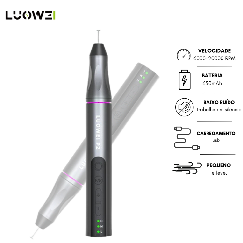 Mini Retífica Profissional Inteligente Luowei P2 A Mini Retífica Luowei P2 é uma ferramenta versátil e de alta precisão, ideal para trabalhos detalhados em diversas superfícies. Equipada com um motor de ultra-alta velocidade e um corpo de metal integrado, proporciona um desempenho estável, silencioso e sem vibrações. Destaques do Produto: - Movimento em bronze – maior durabilidade e resistência - Corpo texturizado – design ergonômico para melhor aderência - 8 cabeças de moagem intercambiáveis – adaptável a diferentes necessidades. - Fácil substituição da cabeça de moagem – basta encaixar ou remover com um simples movimento - Operação suave e segura – desempenho confiável para cortes, polimentos e acabamentos. Sobre o produto. - 5V / 0.5A - 6000 / 20000RPM. - 8 Pontas para substituição. - Inclui cabo para carregamento. Os produtos passam por cuidados rigorosos de nossa equipe especializada, assim como são embalados de forma estratégica para evitar impactos no trajeto de nosso centro de distribuição até sua casa. Enviaremos conforme o anúncio e embalado da melhor forma possível. Produto disponível a pronta entrega! Emitimos NF.