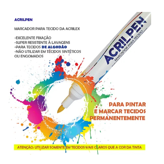 Caneta para Tecido Acrilpen Preto É uma caneta com tinta para tecido. Com ela você pode marcar uniformes e roupas, fazer contornos, detalhes e pinturas sobre tecidos, além de poder assinar seus trabalhos de artesanato em geral, tem excelente fixação a frio e grande resistência a lavagens quando aplicada sobre tecidos de algodão sem goma.