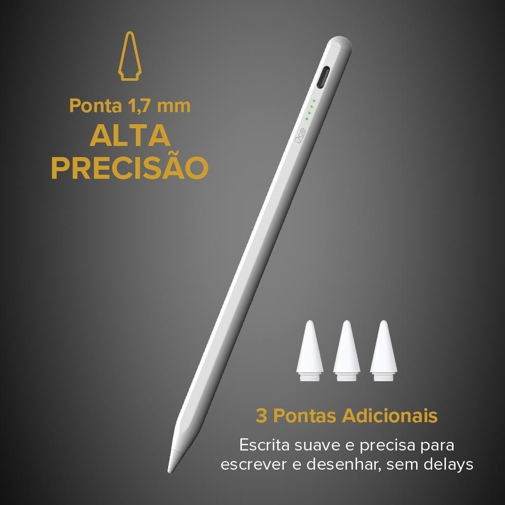 Caneta para iPad Pencil Stylus GO A caneta Pencil Stylus GO oferece uma experiência de escrita e desenho excepcional, graças à sua tecnologia de alta precisão e design inovador. Com uma bateria de longa duração, você pode se concentrar em dar vida às suas ideias sem interrupções. A tecnologia de rejeição de palma permite que você descanse sua mão no iPad enquanto escreve ou desenha, sem interferências indesejadas. Além disso, a detecção de inclinação da caneta possibilita uma variedade de traços e efeitos de sombreamento, dando mais vida e profundidade às suas criações. Com fixação magnética, a Pencil Stylus GO fica sempre à mão, pronta para ser usada. Sua escrita suave e precisa, graças à ponta de 1,7 mm, garante que seus traços sejam fiéis à sua criatividade, sem delays ou imprecisões. Para garantir que você nunca fique sem usar sua caneta favorita, a Pencil Stylus GO acompanha 3 pontas extras para substituição. Experimente uma nova maneira de interagir com seu iPad e libere todo o seu potencial criativo com a Pencil Stylus GO. Compatibilidade: iPad (6 geração) A1893 | A1954 iPad (7 geração) A2197 | A2198 | A2200 iPad (8 geração) A2270 | A2428 | A2429 | A2430 iPad mini A2133 | A2124 | A2125 | A2126 iPad Air A2123 | A2152 | A2153 | A2154 A2316 | A2324 | A2325 | A2072 iPad Pro A1980 | A2013 | A1934 | A1979 A2228 | A2068 | A2230 | A2231 A1983 | A2014 | A1895 | A1876 A2229 | A2069 | A2232 | A2233 Especificações Técnicas: Peso: 13 g Bateria: 140 mAh Dimensões: 165 x 8,9 mm Hora de Trabalho: Até 10 h Tempo de Carregamento: 90 min Material: Caneta em liga de alumínio e pontas em POM Itens Inclusos: 1 Caneta Pencil i2GO Stylus GO Para iPad e iPad Pro Branca + 3 Pontas Extras + Manual *Garantia i2GO:Esse produto está garantido contra defeitos de fabricação durante 1 ano.